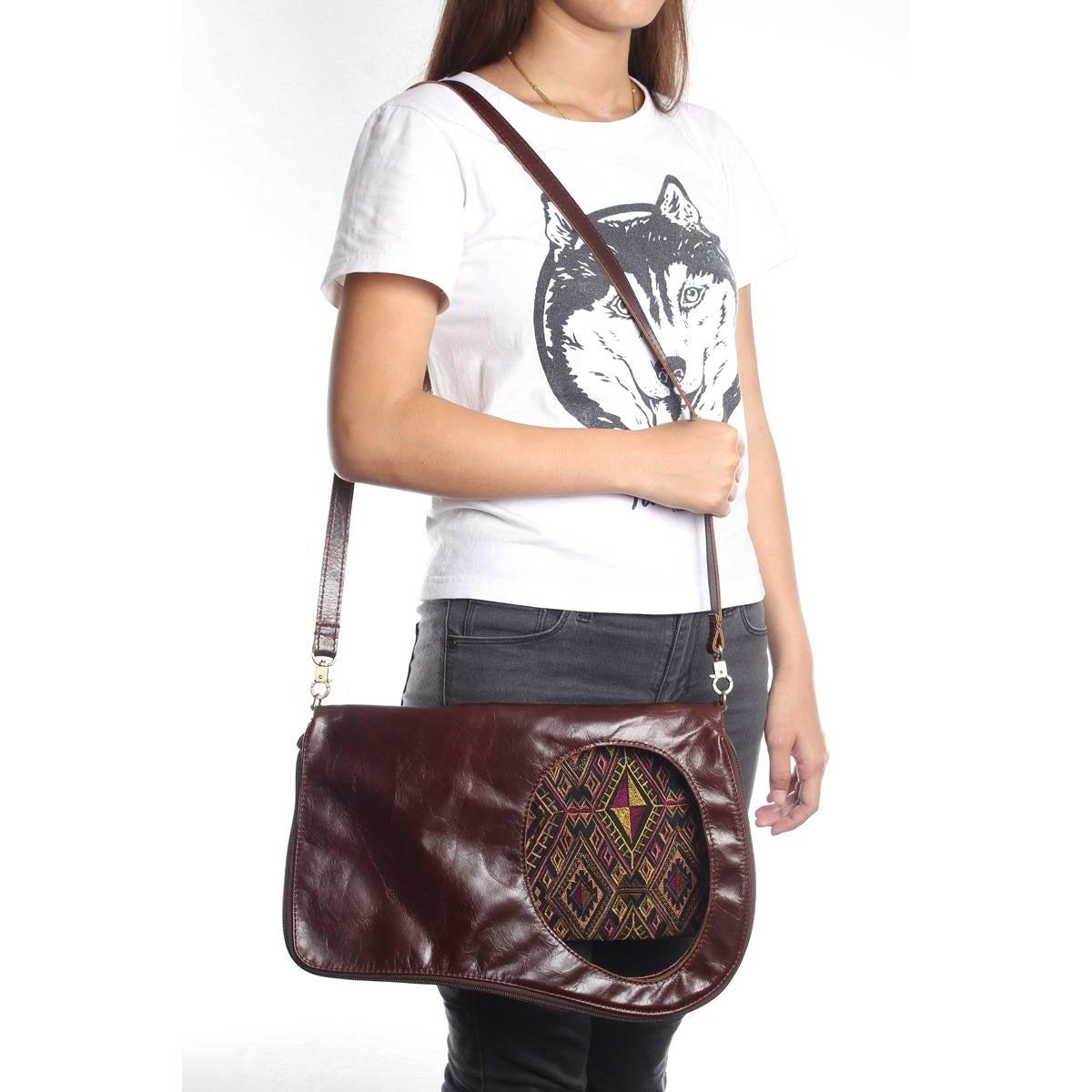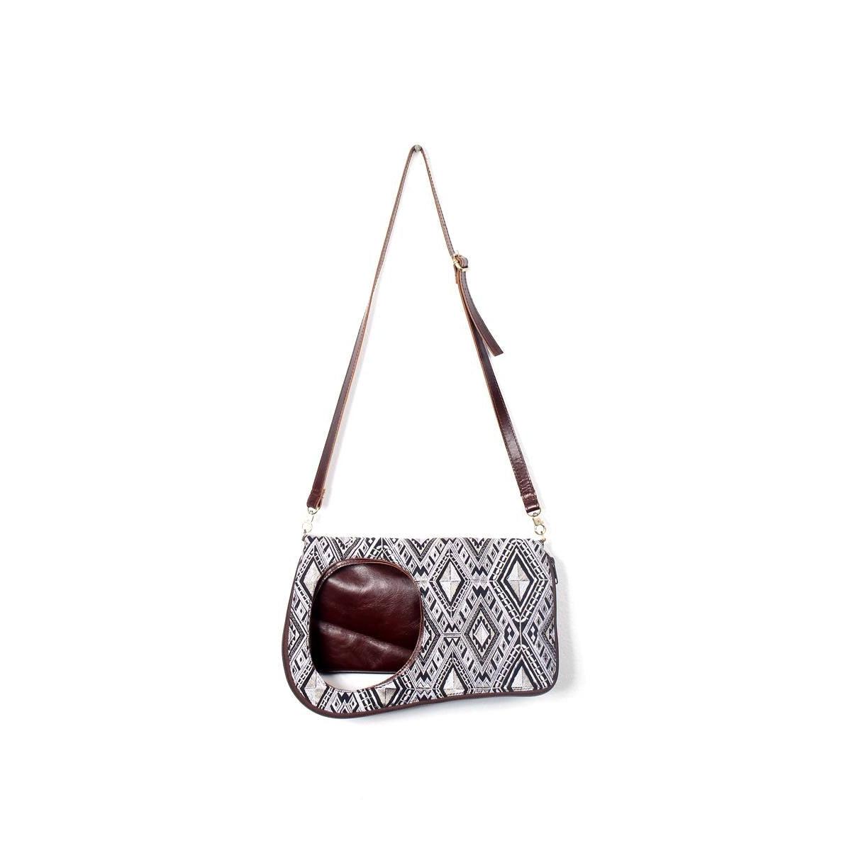 This geometric handbag is the perfect accessory to add some boho chic style to your outfit. Handcrafted in Thailand, this bag features an intricate embroidered pattern with the highest quality leather available! Lined inside with black cotton. Complete with a zippered pocket and leather shoulder strap, this bag is complete with a handy snap-hook that clips around belts loop or stroller straps. This unique bag will steal gazes wherever it goes!
