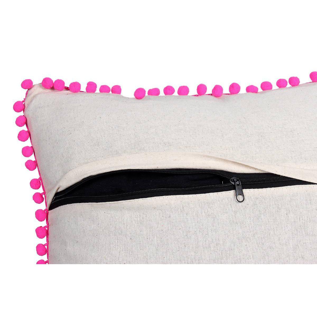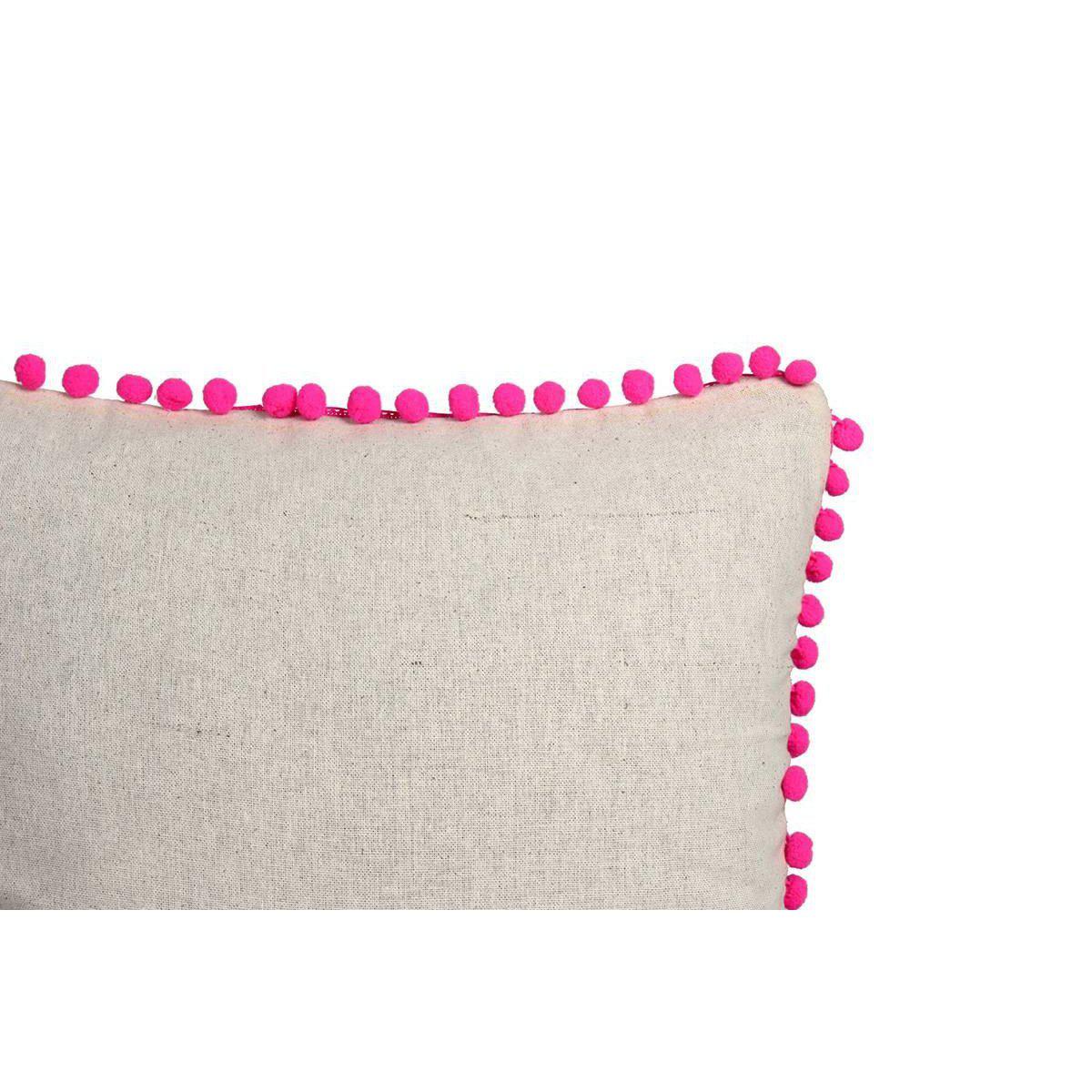 Natural cotton pillow cover ringed with bright pom poms. Zip closure on the back.