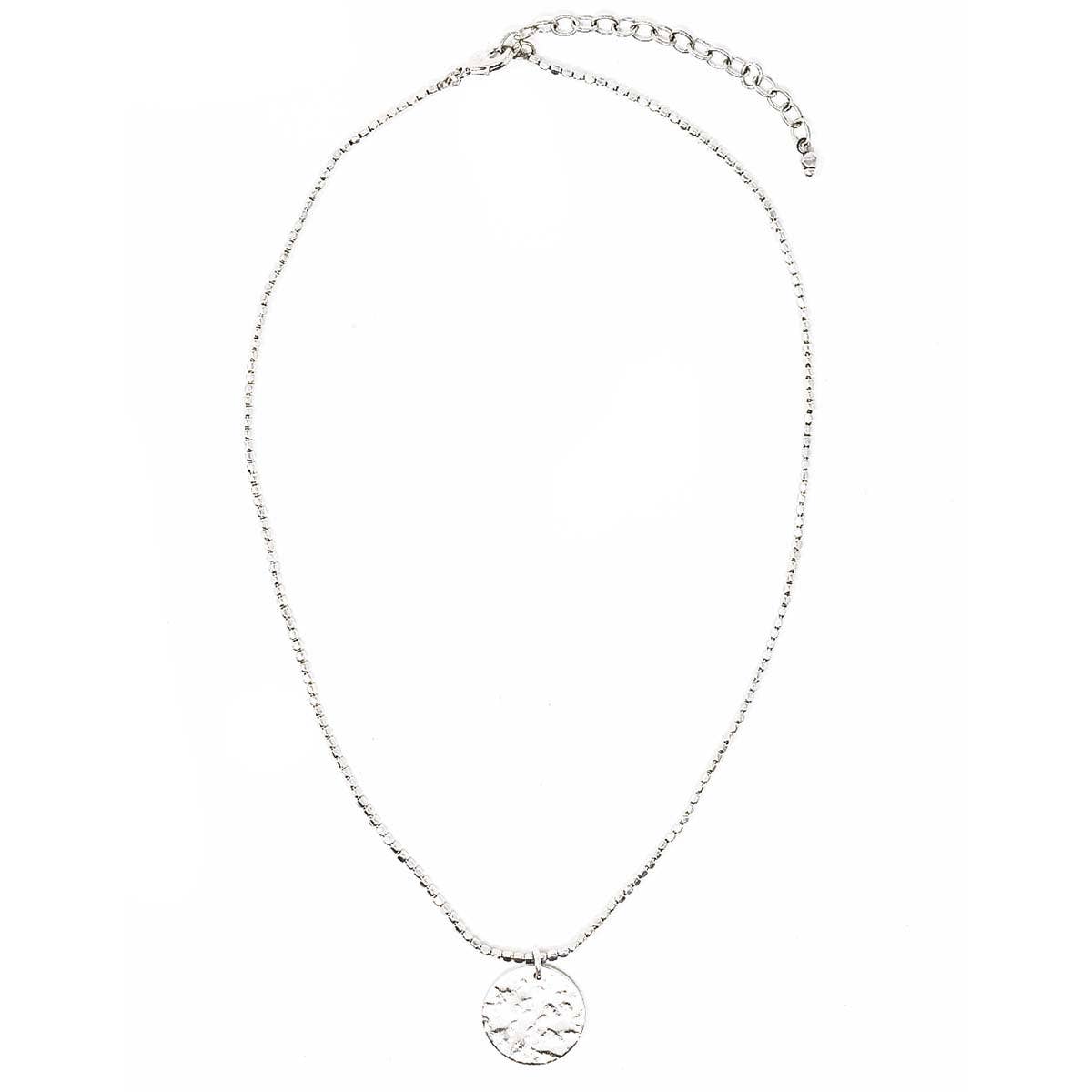 A simple textured matte silver disc hangs from a delicate chain to create a modern silhouette. Layer with longer pieces for an on-trend look. Measures approximately 16.275" long with a 2.5" extender; pendant drops .75". Sustainably handmade by women artisans in India.
