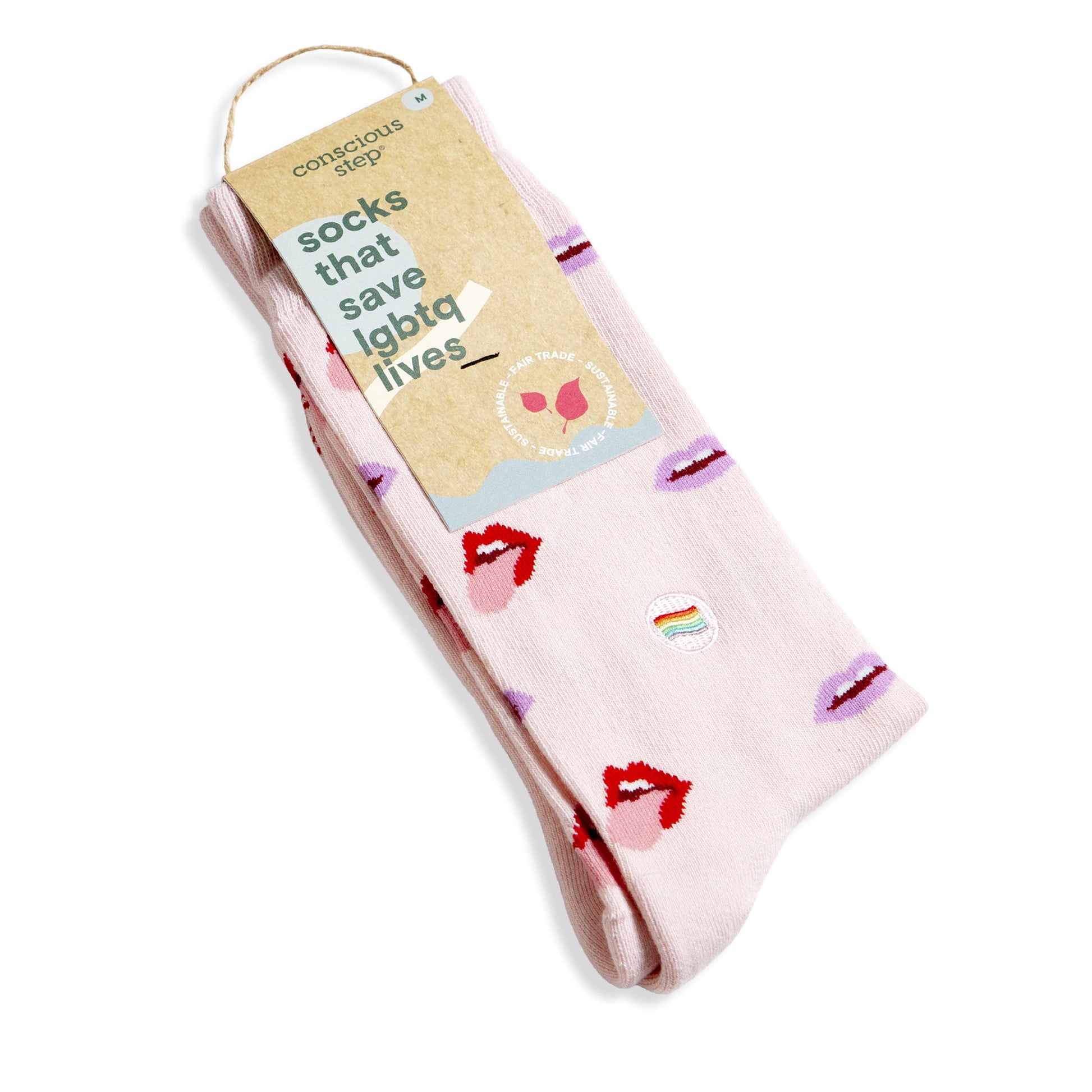 Say it loudly for the people in the back: self-expression is important! Stay loud, proud, and show your support in these pink socks with purple and red lips.