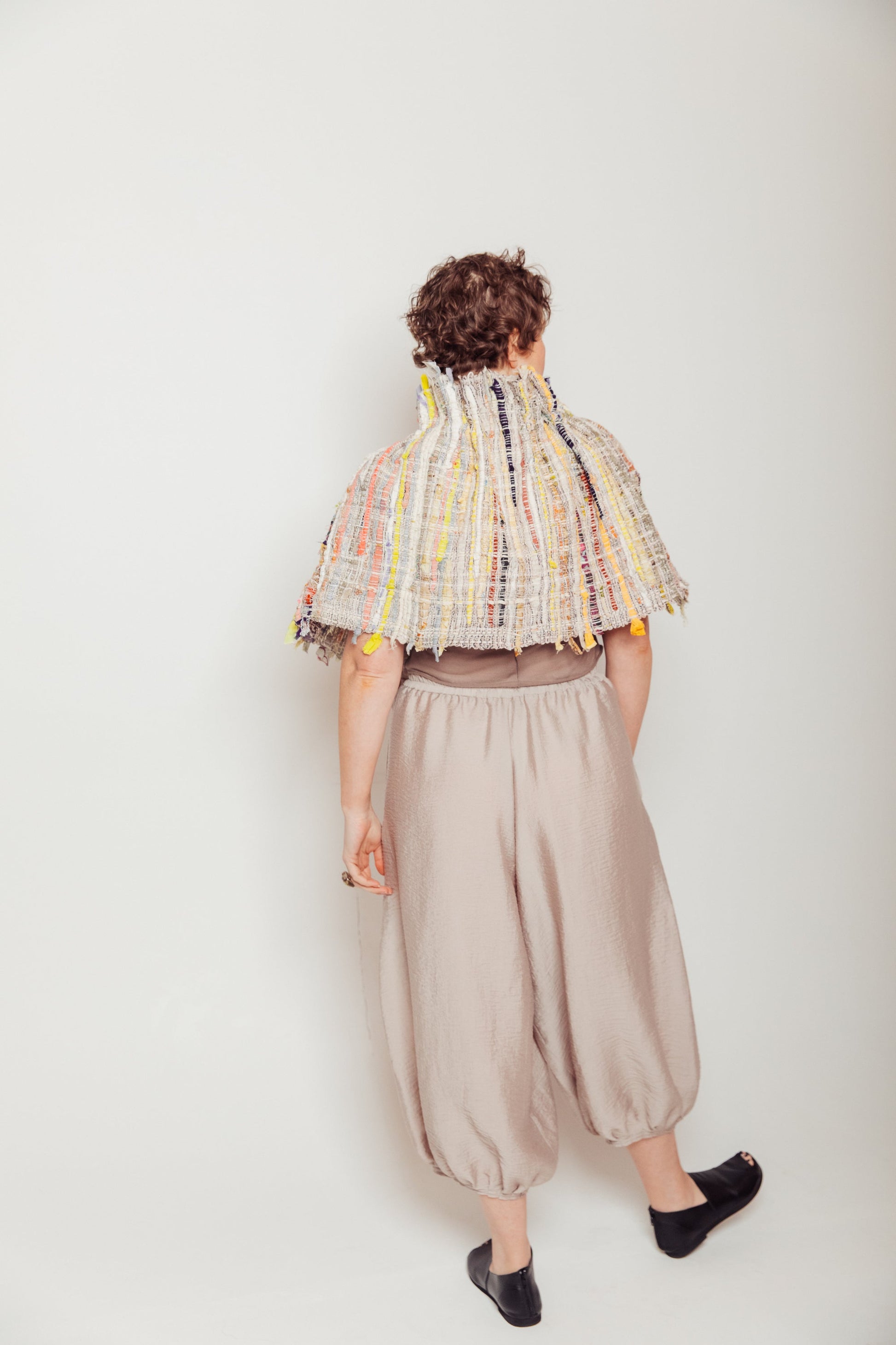 Variable Geometry: Leave the drawstrings slack for a traditional, expansive scarf. Gather one side to create a sculptural cape, or cinch both to transform the piece into a voluminous snood, a neck ruff, or even a gathered wrap skirt.