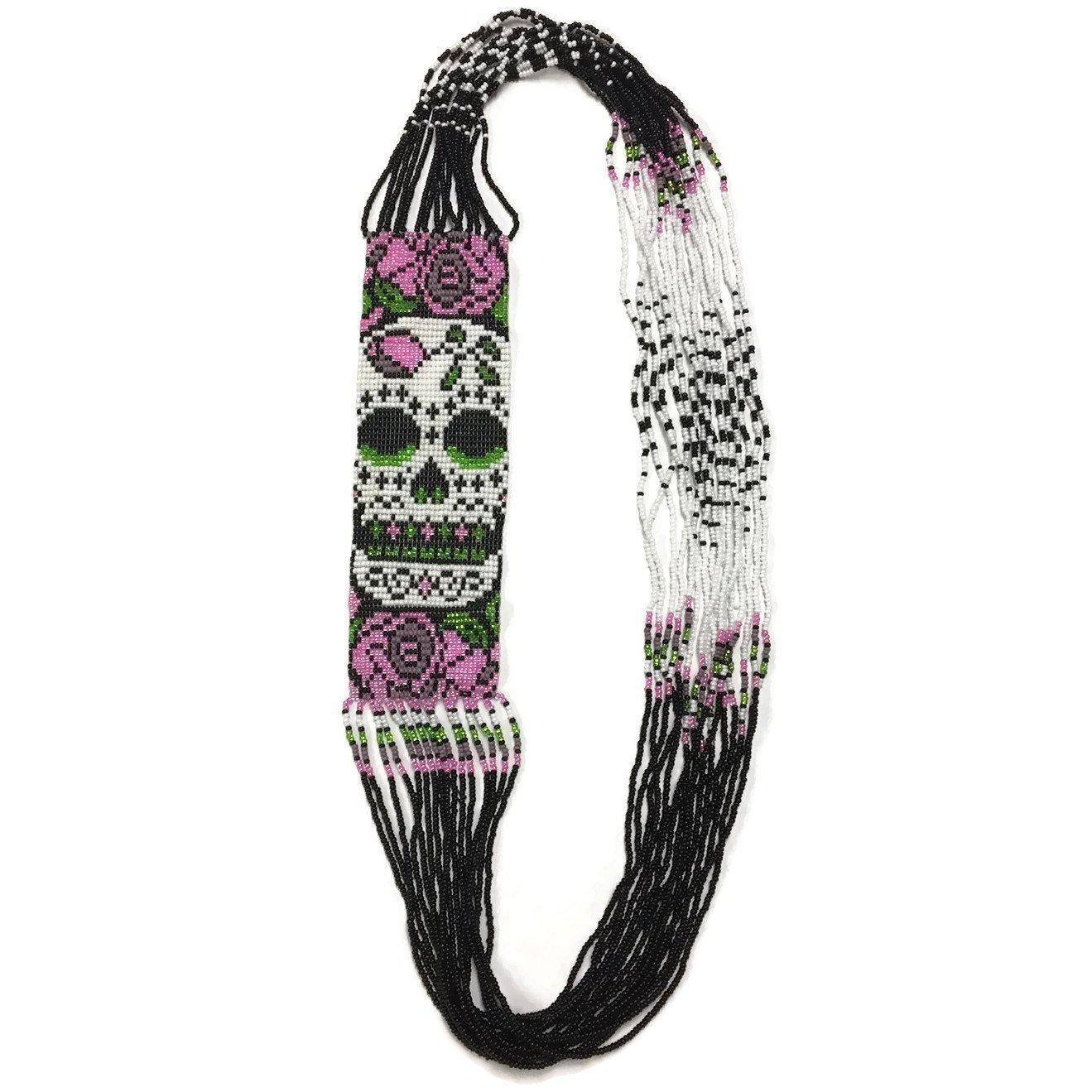 Our sugar Skull necklace is expertly hand beaded by our artisans in the highlands of Guatemala. It has a vibrant and striking sugar skull image made by using Czech seed beads. Multiple strands of matching beads balance the look. Slips over your head.