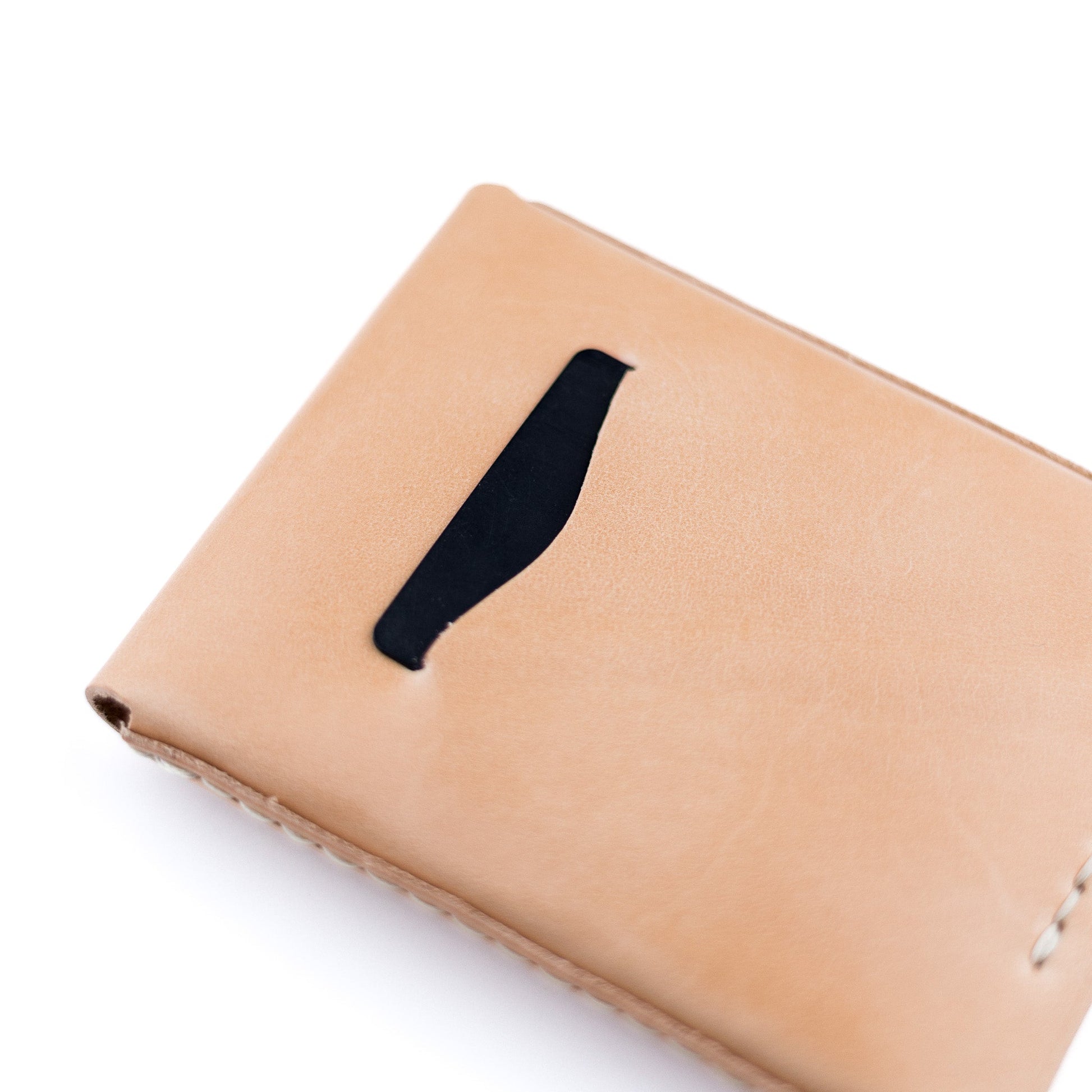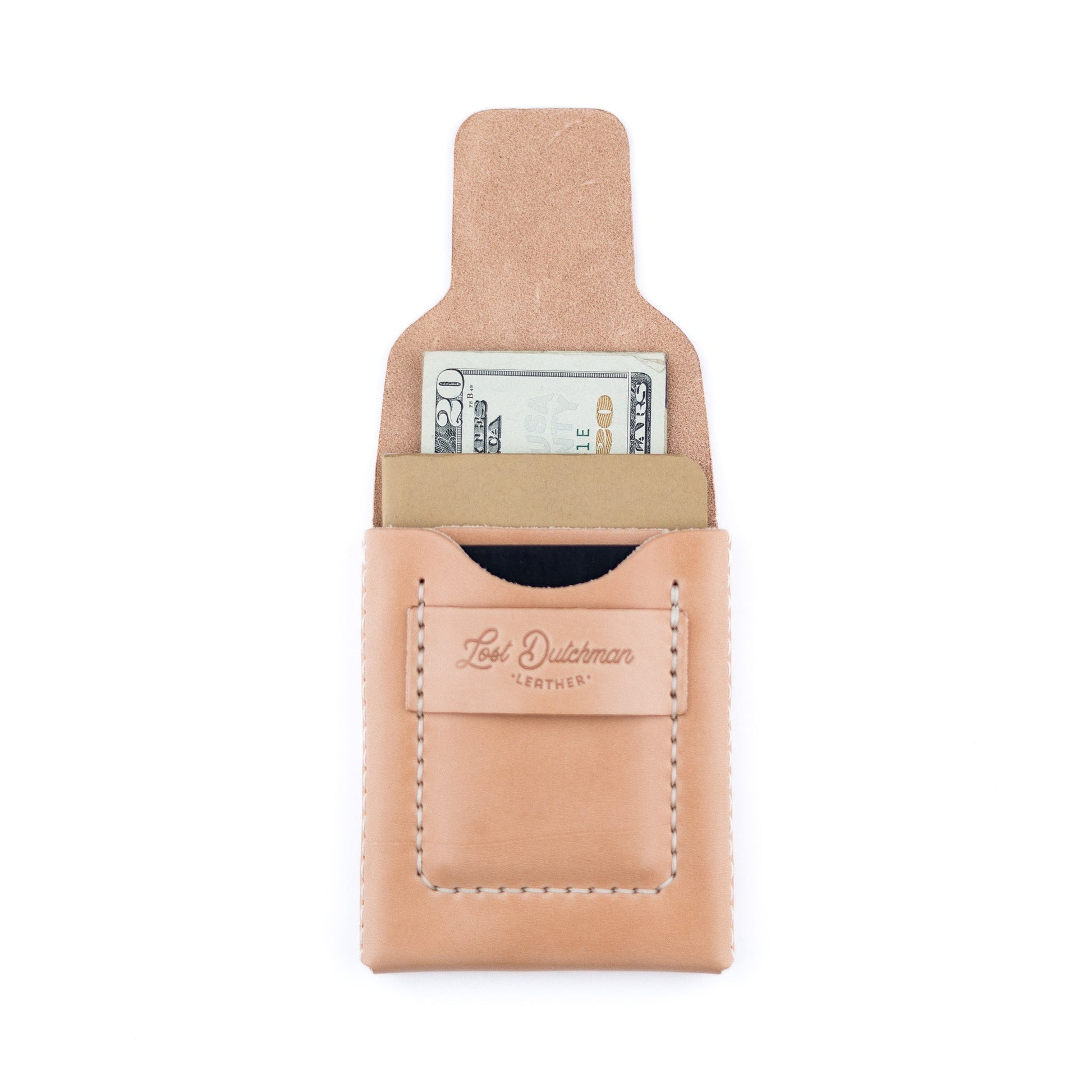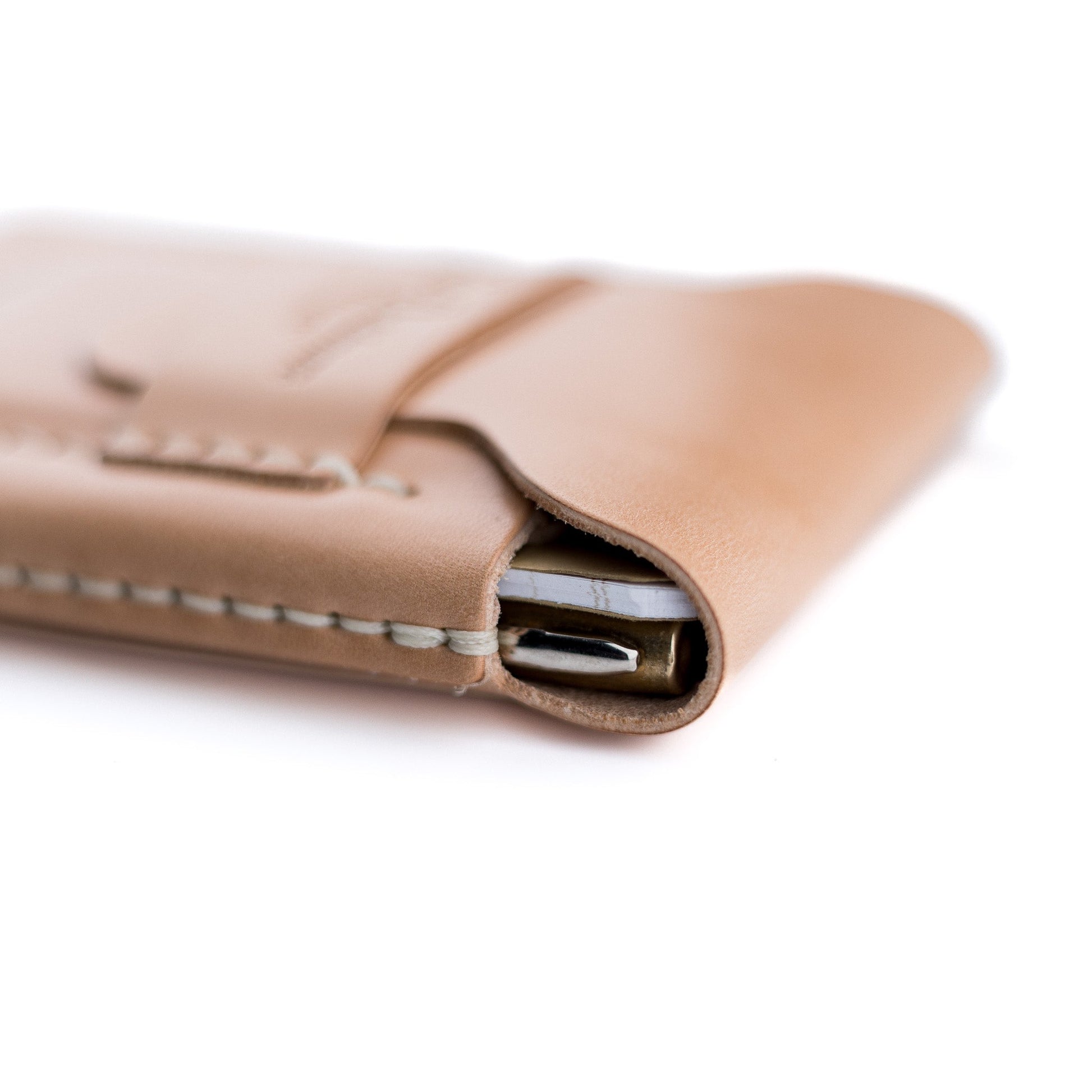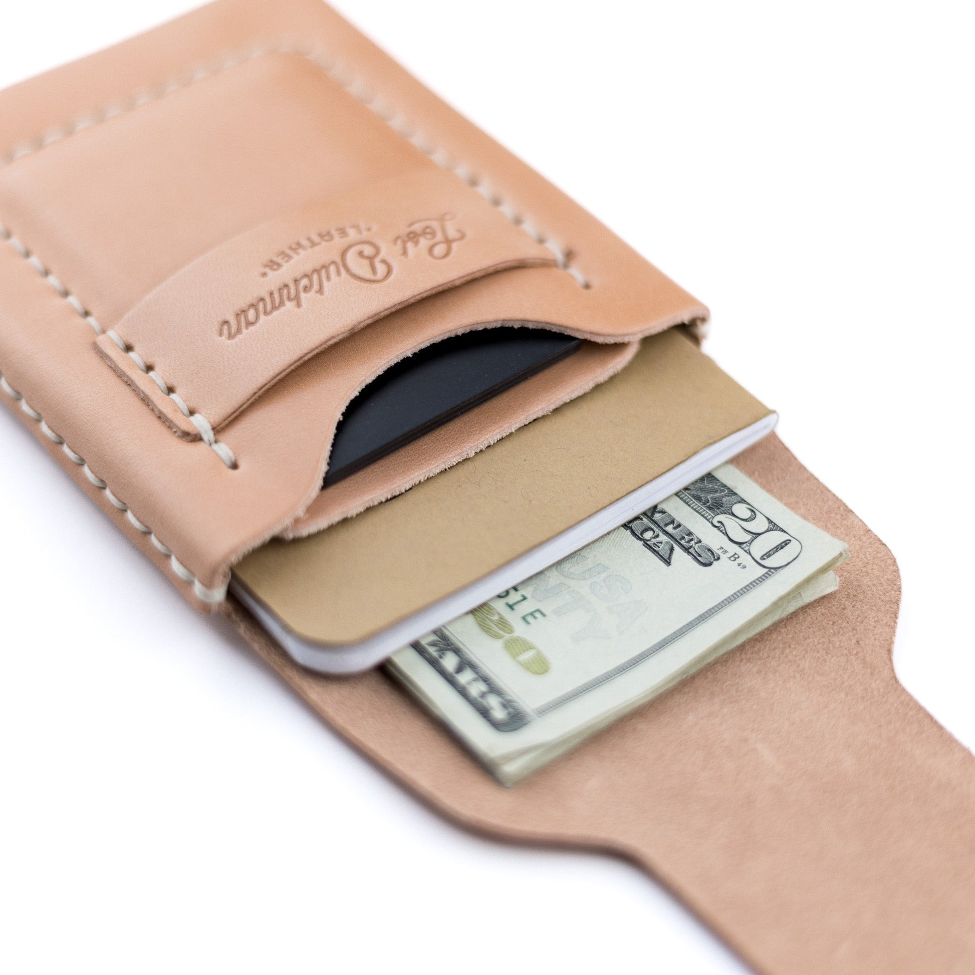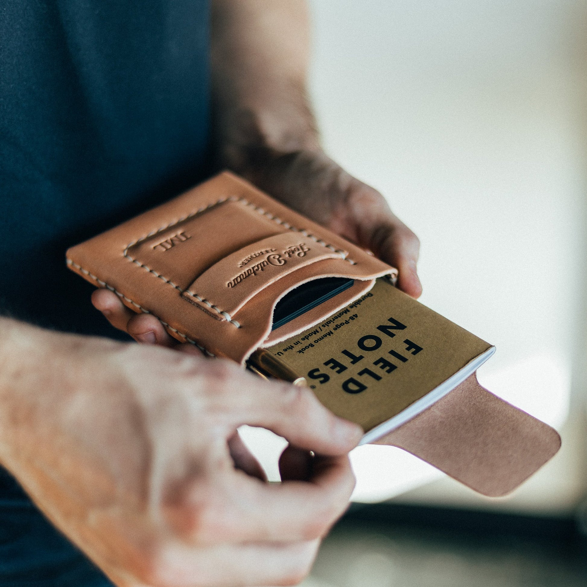 The front flap keeps contents secure. Right inside the flap is the card pocket. The center area fits a Field Notes (or other 3.5x5.5" notebook) and/or a passport, or two notebooks. A rear compartment fits cash and more. The easy-access card pocket on the back of the wallet is an optional add-on.
