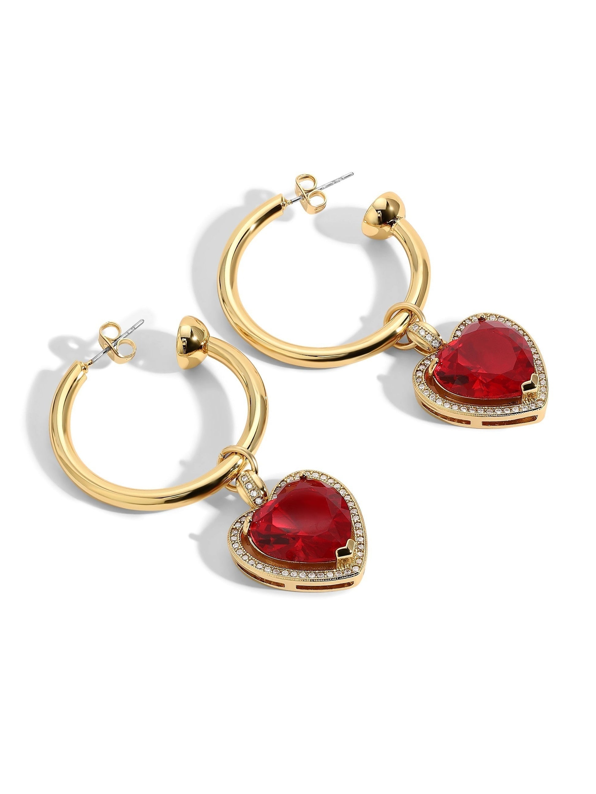 Features a pair of nail-head hoop earrings with post backings and large ruby red & crystal CZ-studded heart charms. Made from 18K gold-dipped brass.