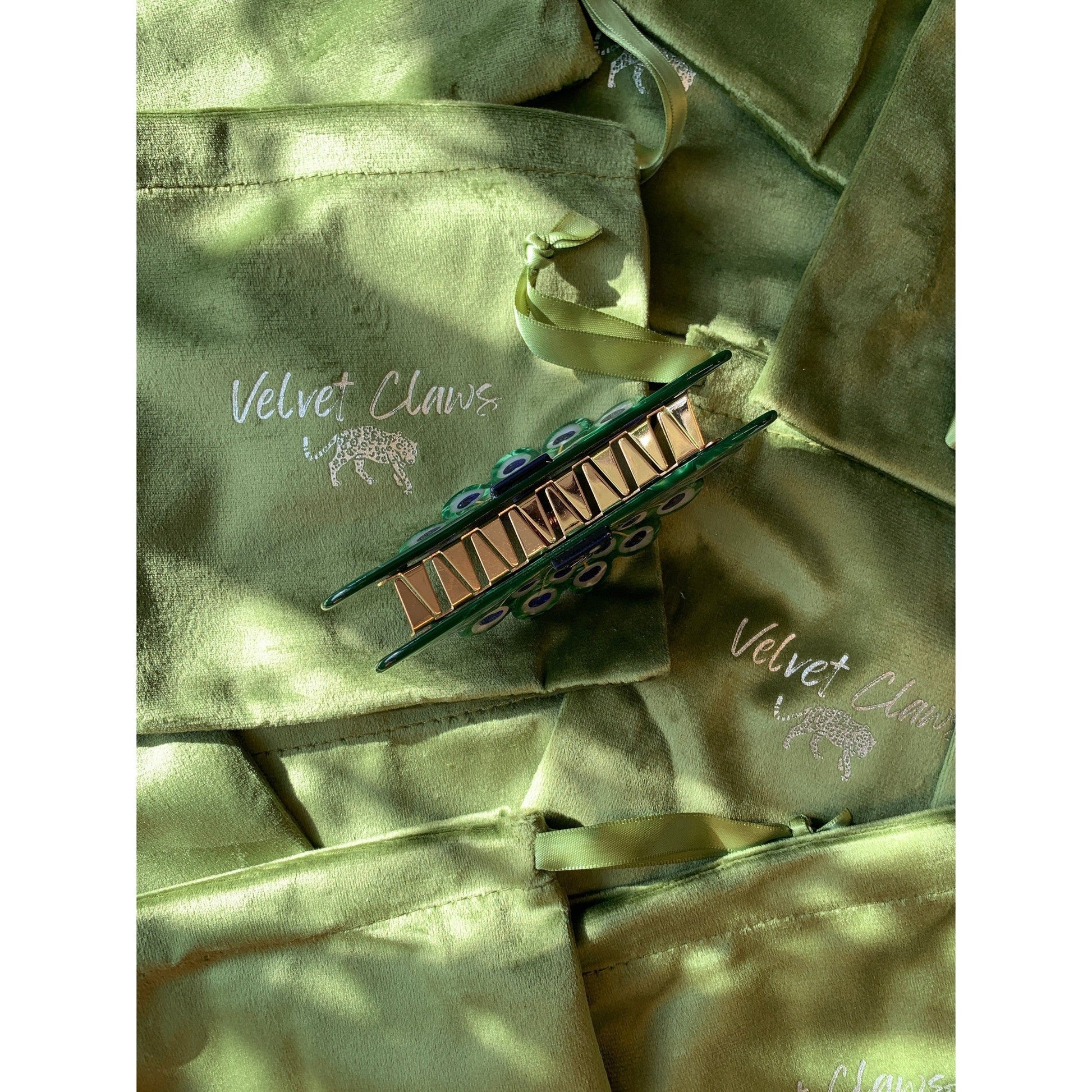 Elevate your hairstyle with the Velvet Claws Hair Clip featuring a stunning peacock design in rich green and blue hues. This lightweight acetate hair claw securely holds your hair in place for a chic half up, half down look. Packaged in a luxurious velvet travel pouch, it makes a thoughtful gift for fashion-forward friends.