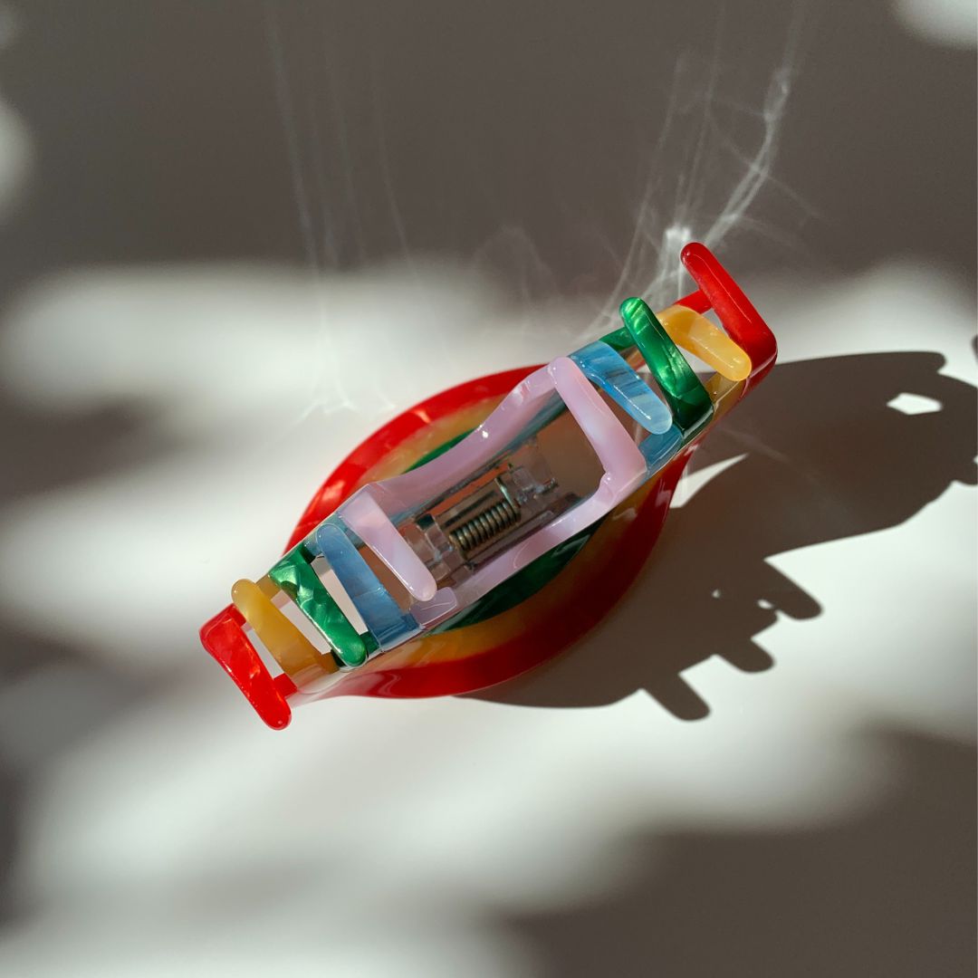This Pride month, stand out with the vibrant Curvy Rainbow Claws Mini Hair Clip. The lightweight acetate construction and strong claw design make it perfect for creating a stylish half up, half down look while expressing your pride. Comes with a luxurious velvet travel pouch, making it a thoughtful gift for anyone who loves to accessorize.