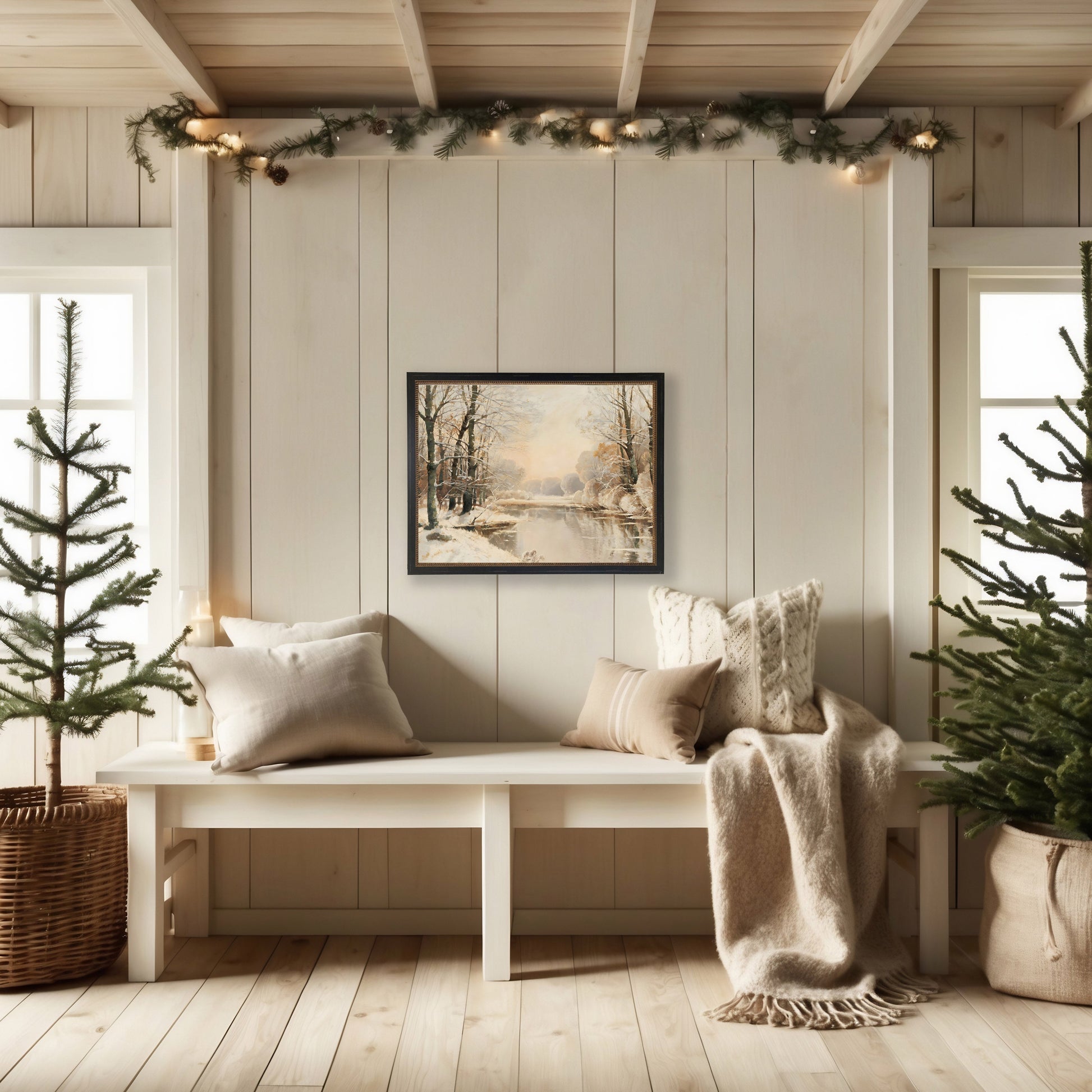 This vintage-inspired print, framed in a black, gold-beaded wooden frame, features a vintage oil painting of a snowy river scene. Sized at 21 inches by 17 inches, this made in the USA frame makes for a beautiful addition to any wall. Made in USA Made with real wood Hangs from back-mounted hardware Encased in glass