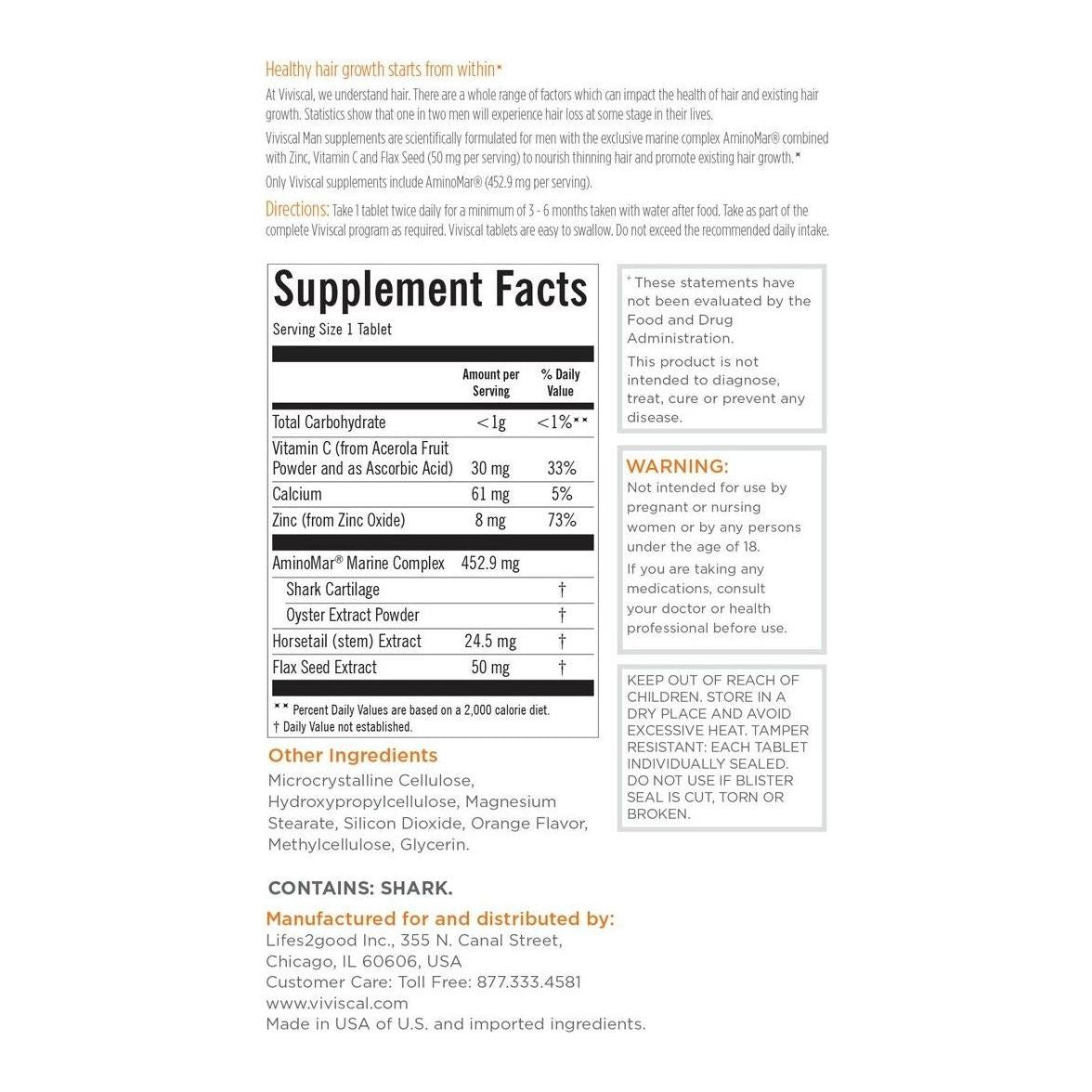 Viviscal Man hair growth supplements contain the exclusive marine complex AminoMar®, as well as healthy hair nutrients including Vitamin C, Zinc, Horsetail (stem) Extract and Flax Seed Extract. Viviscal Man hair growth pills contain some ingredients of natural origins. Viviscal Man has been scientifically formulated to nourish hair from within and to promote existing hair growth.*