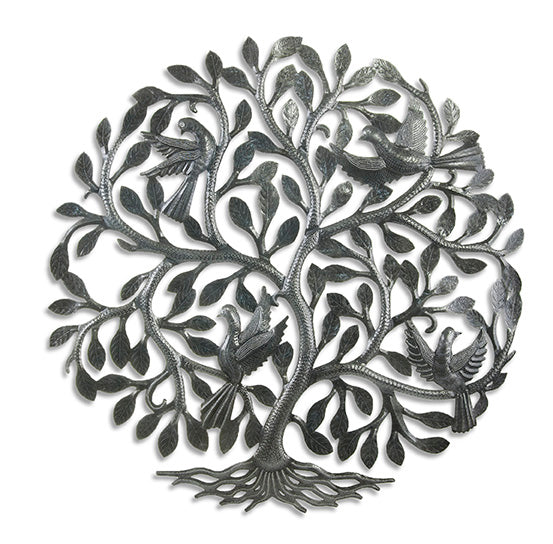 A beautiful and graceful round tree of life metal art piece with four birds and winding tree roots. The perfect decorative Haitian metal art piece for your home's patio or garden area. Created by Louis Wilfrid.