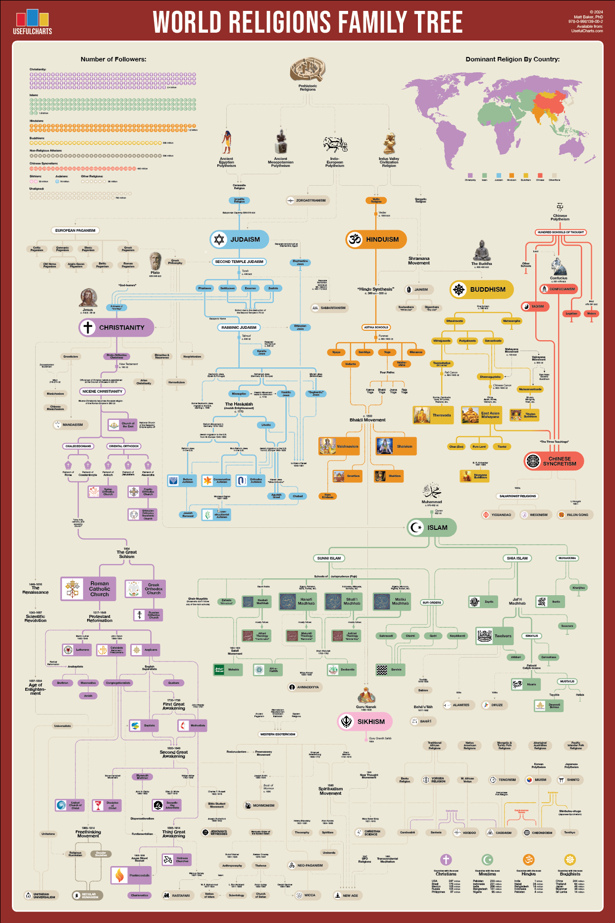 Discover the comprehensive family tree of the world's major religions, featuring all key branches of Buddhism, Chinese Religions, Christianity, Hinduism, Islam, Judaism, and more. This poster offers an insightful overview perfect for deepening your understanding of global faiths.