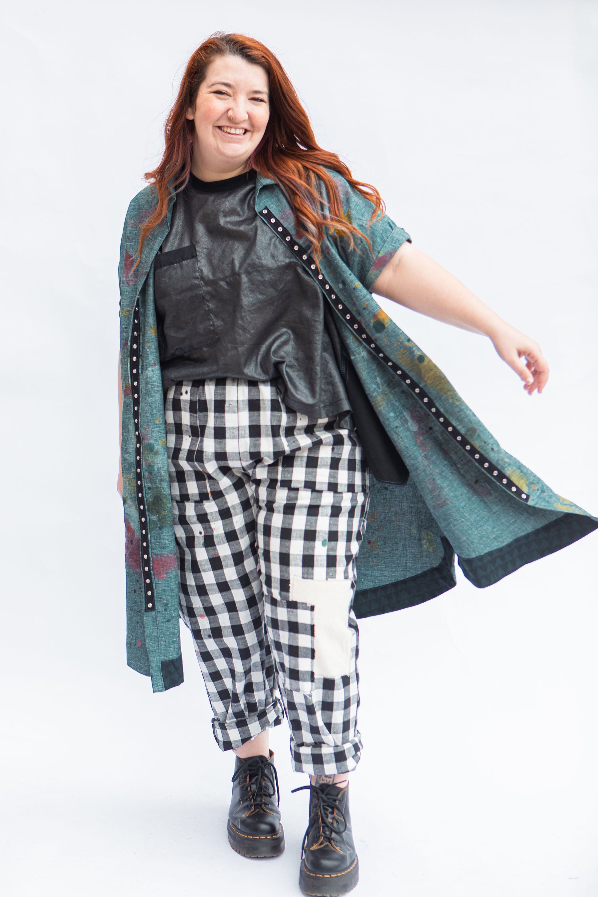 Virginia is wearing the XS Pocket Pant with the Reverse/Reverse top in Chambray and Shayna is wearing the 2X with the Boxy Tee in Lux