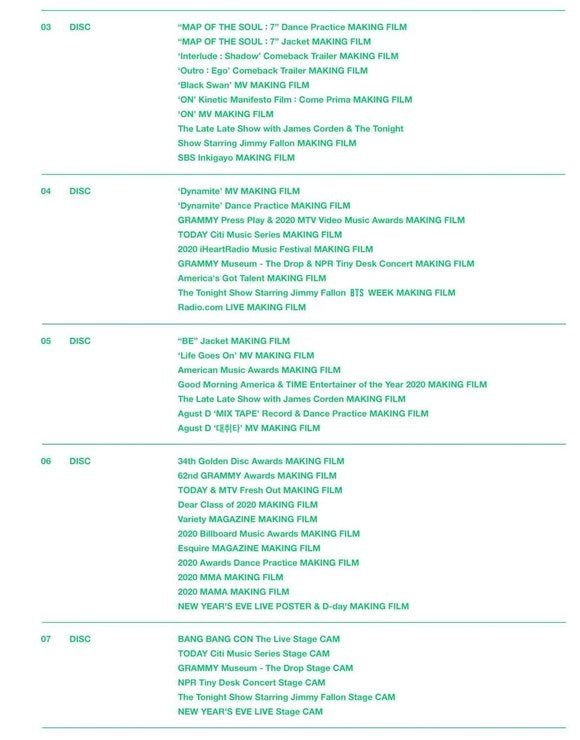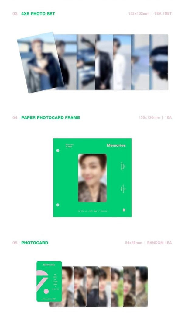 The "BTS Memories of 2020" DVD, which contains all of the glorious 2020 BTS, includes seven discs that last for about 722 minutes, a classic ring binder cover from Memories, a 214-page photobook, postcards and frames, and PHOTO INDEX. , Stamp collection, photo card (random), photo pocket, "2020 Today's BTS (오늘 ì˜ ë°©íƒ„) BOOK" which is indispensable for Memories is fully packed!