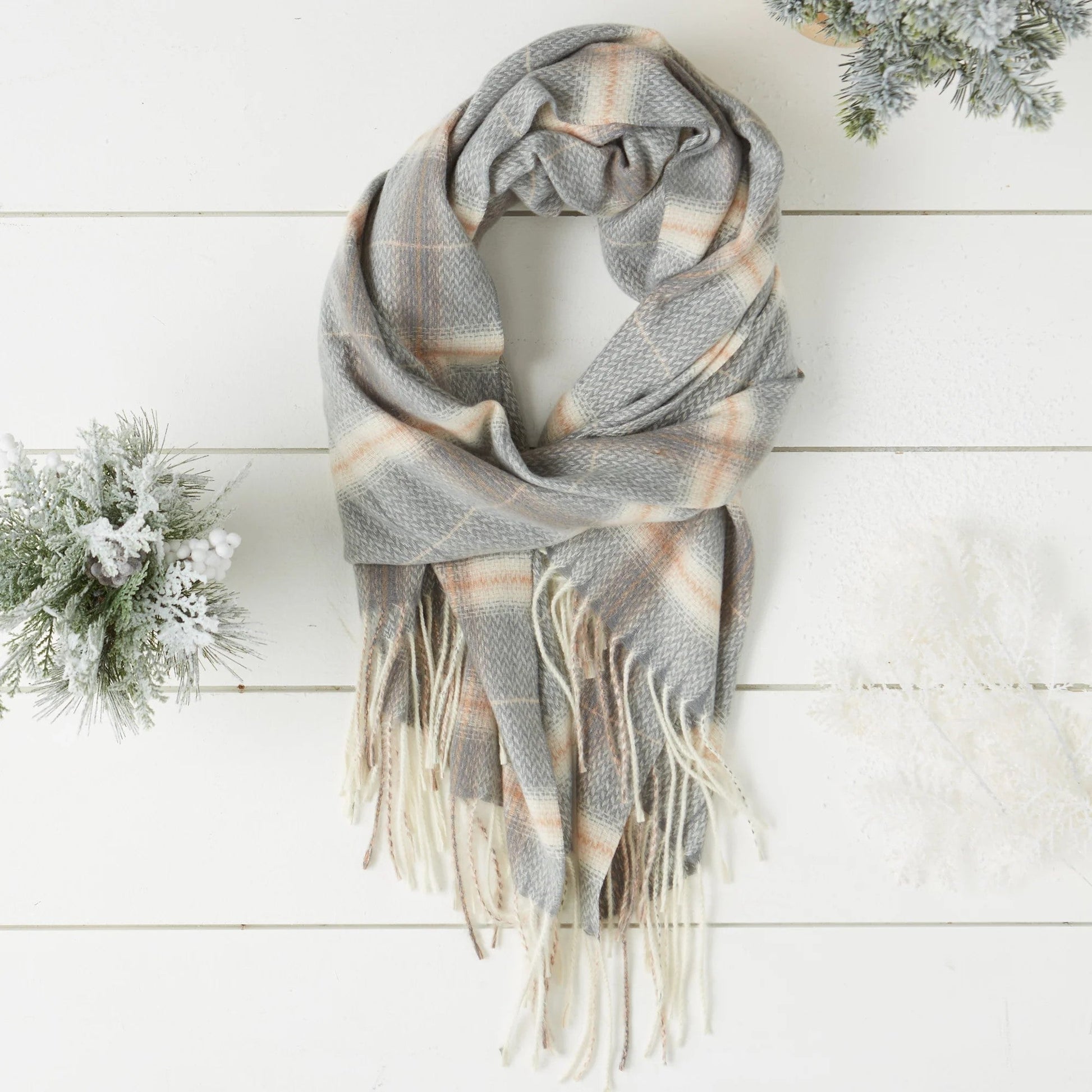 Stay warm and stylish this winter with the Caroline Plaid Scarf in Gray. Measuring 75 inches in length and 27.5 inches in width, this scarf features a unique herringbone weave and twisted fringe for added texture and visual interest. Crafted from 100% polyester, this medium-weight scarf is gender-neutral and incredibly soft to the touch, making it a versatile accessory perfect for any winter wardrobe. Whether you're going for a casual look or dressing up for a formal occasion, this classic plaid scarf is sure to keep you cozy and chic all season long. Makes a thoughtful gift for anyone who loves to stay warm in style.
