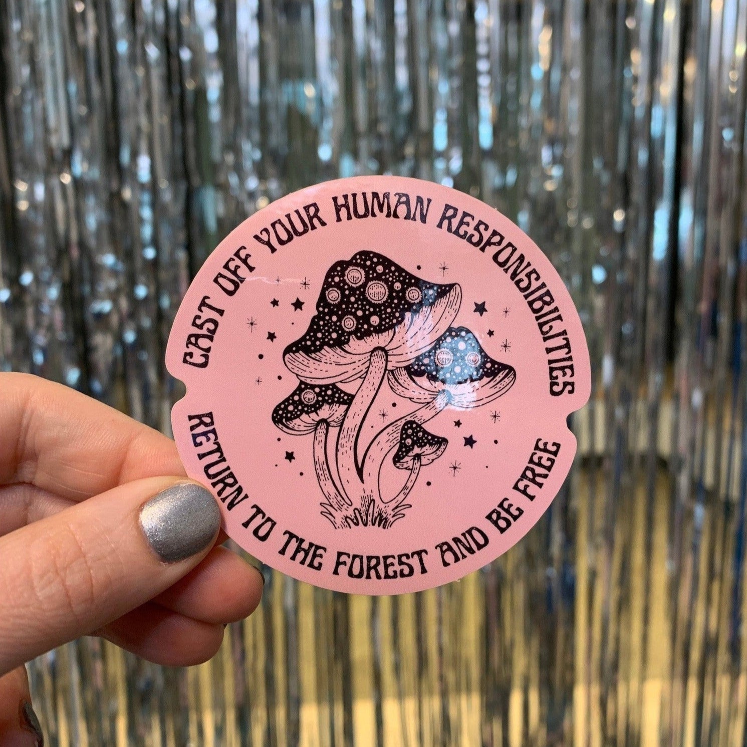 Glossy die cut sticker reads CAST OFF YOUR RESPONSIBILITIES - RETURN TO THE FOREST AND BE FREE with mushrooms and stars at the center.