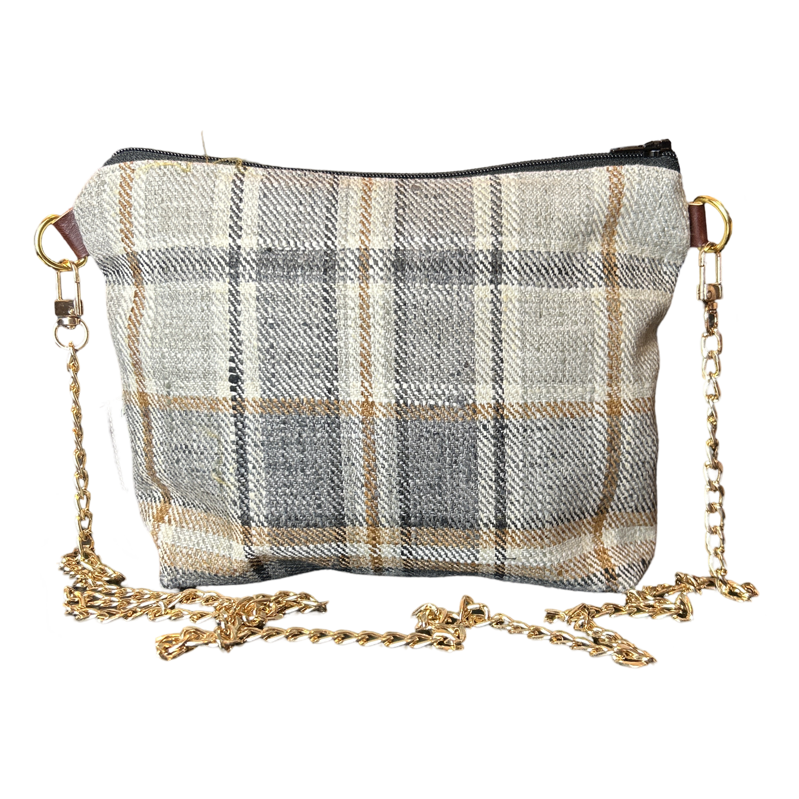 Vintage Hermès Couvertures et Tenues du Jour silk scarf front paired with coordinating tartan plaid reverse. Zippered closure with removable 23" drop gold-tone crossbody chain.