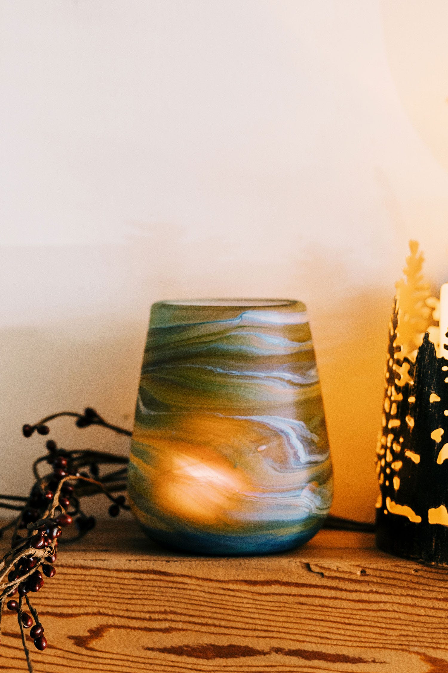 The Desert Sands Candleholder glows like a campfire. You will never see a glow like this, ever, each one is one of a kind. And this one comes with sand from the Holy Land. Phoenician glass blowing is a heritage craft going back thousands of years, creating this range of swirling colors starts with recycled soda bottles that are smashed into pieces, then melted in high-temperature ovens. The molten glass is blown using a steel pipe called a kammasha, while "secret family recipes" elements that are added allow the glass blowers to craft each piece with unrepeatable patterns. Making this your new go-to candleholder for warm, one-of-a-kind mood lighting! Phoenician glass-blowing is a Natsheh family tradition at Hebron Glass in the West Bank, past down through generations. Learning this highly-prized, ancient art takes at least five years of apprenticeship.