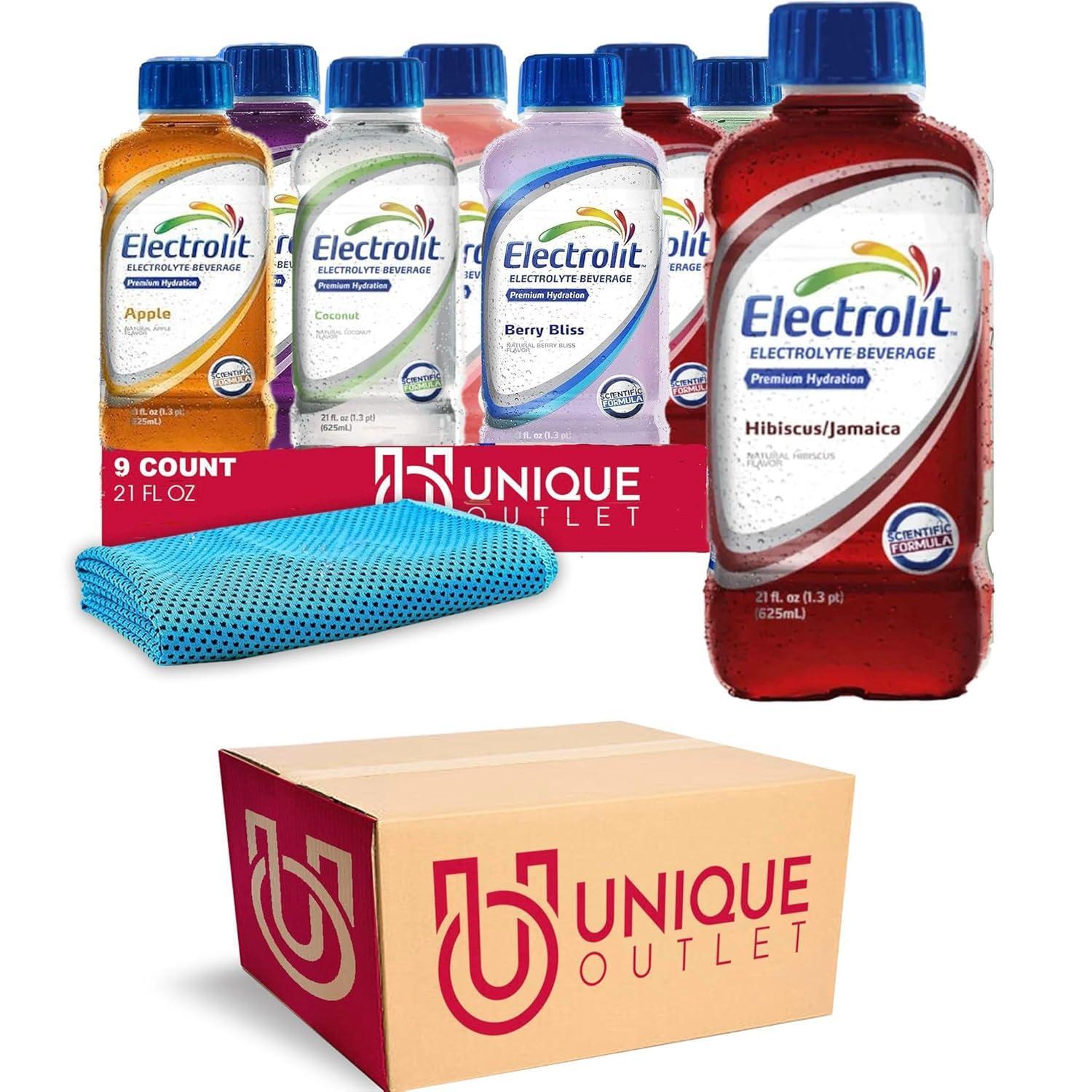 Electrolit Collection 9-Pack Of Hydration Drink With Electrolytes, 21 Fl Oz Plastic Bottle + 1 Microfiber Cooling Towel By Unique Outlet Brand