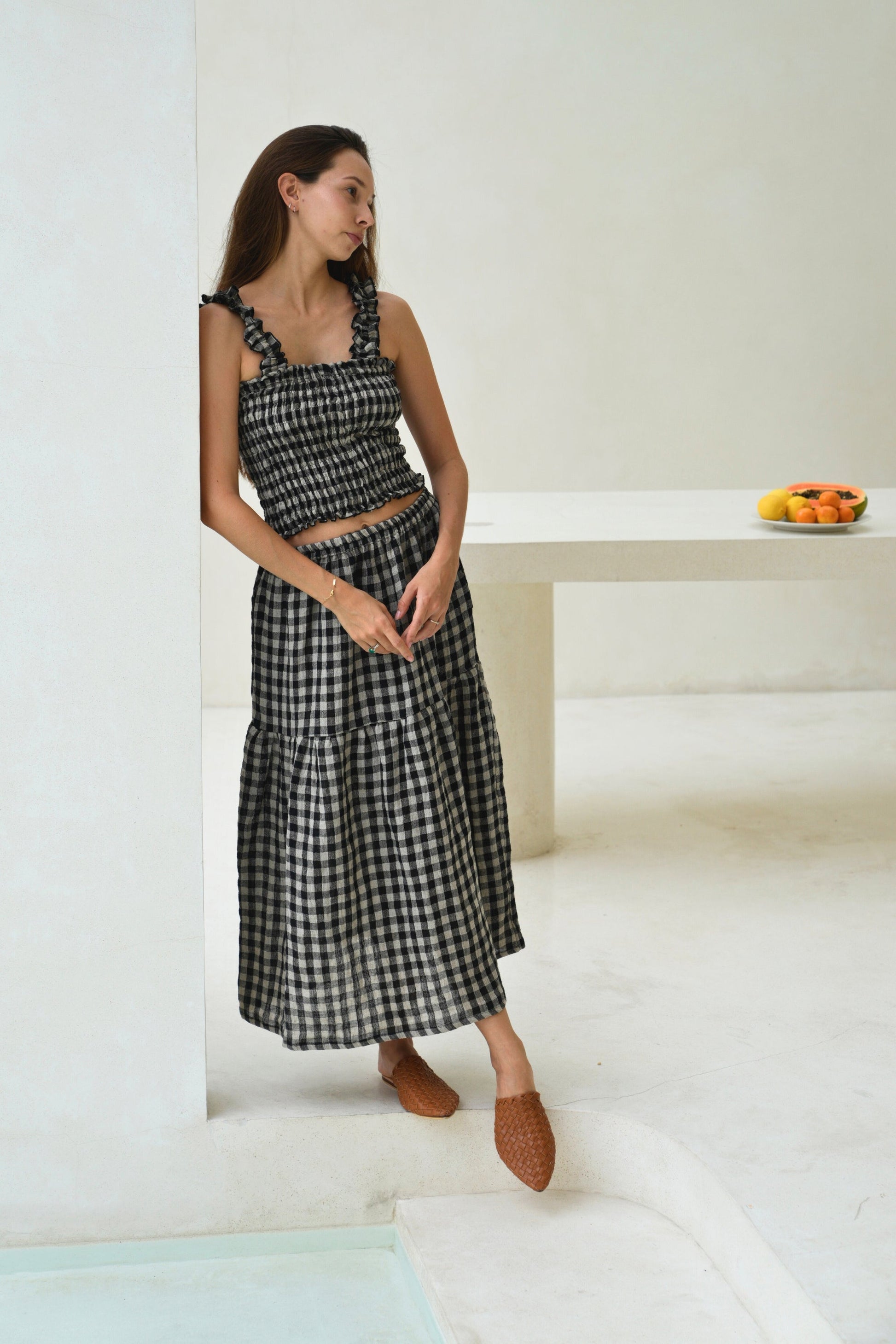 Comfort and easy fitting, this skirt can be paired with anything from your suitcase while traveling. Our crinkle gingham fabric is perfect to throw in your suitcase or wear on the plane, no need to iron.