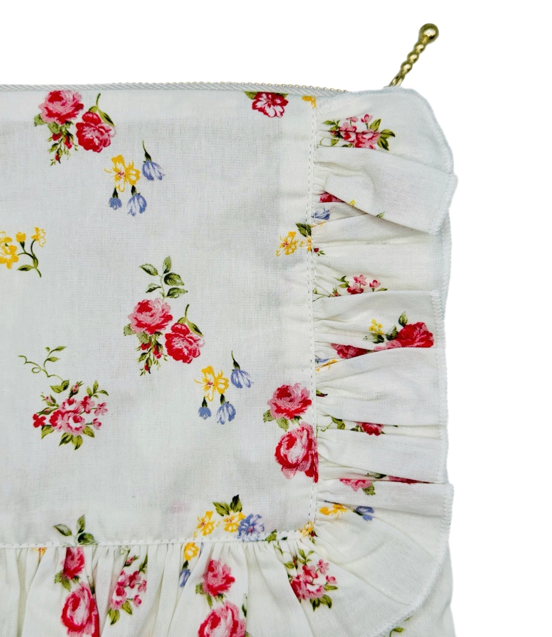 Cottage Charm meets everyday function in this sweet, vintage-inspired floral zippered pouch. Made from 100% recycled cotton inside and out. Features our English Rose Posy print, red rose bouquets with tiny blue and yellow florals, finished with a romantic ruffle trim and smooth brass zipper. Perfectly sized for keeping little treasures, pacifiers, hair bows, or mama essentials neatly tucked away, the Timeless Floral Ruffle Zipper Pouch brings a soft touch of nostalgia and beauty to your day, making even the smallest essentials feel special. Dimensions: "9.06 × 7.09” Main Fabric: 100% Recycled Cotton Lining: 100% Recycled Cotton Looking for more floral styles? Explore the full Timeless Floral Ruffle Zipper Pouch Collection more than 20 unique prints, all made from recycled cotton with delicate ruffle details you’ll love.