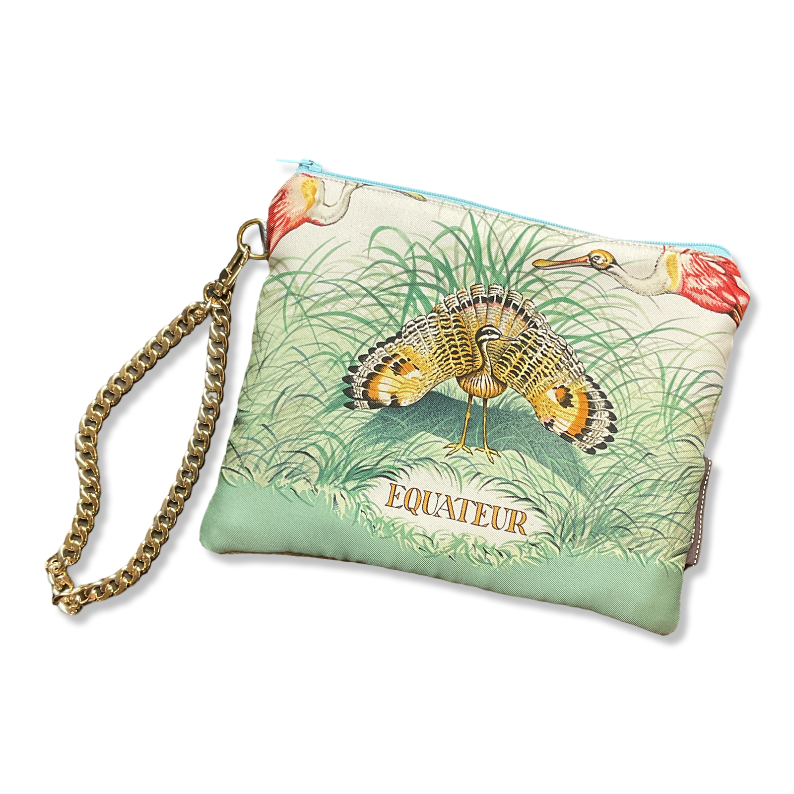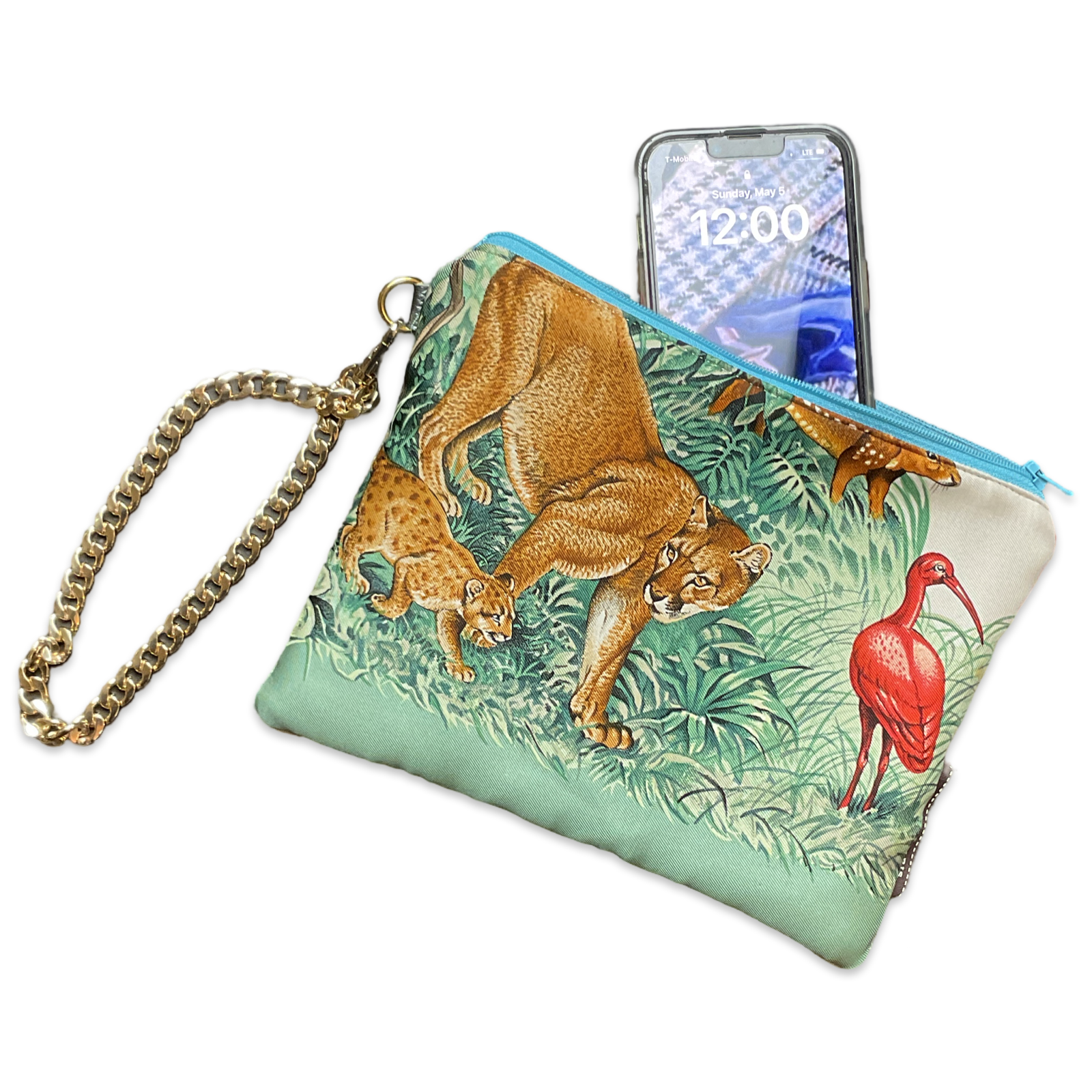 Vintage Hermès Equateur silk scarf front paired with coordinating animal print reverse. Zippered closure with removable 15” gold-tone wristlet chain.