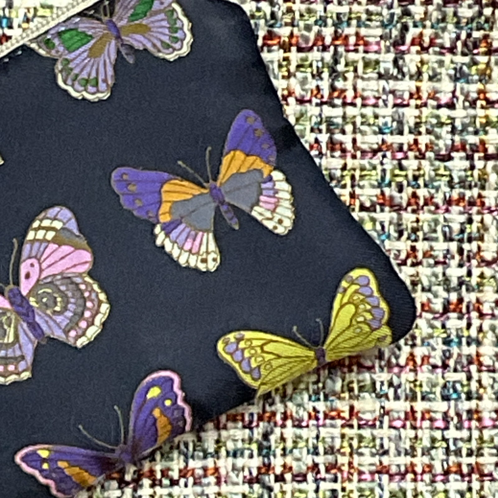 Vintage Gucci 100% silk scarf front paired coordinating tweed reverse. Fully lined with zipper closure and removable 23" drop gold-tone crossbody chain.