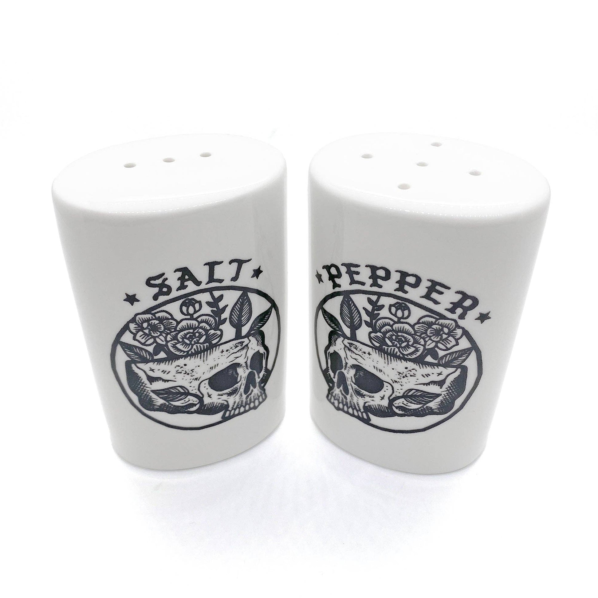 Elevate your kitchen decor with these unique Floral Skull Salt and Pepper Shakers, designed by artist Villy Villain for Sourpuss. Crafted from food-safe ceramic, these shakers are both functional and stylish, making them a standout addition to your dining table or a thoughtful gift for the spooky season.
