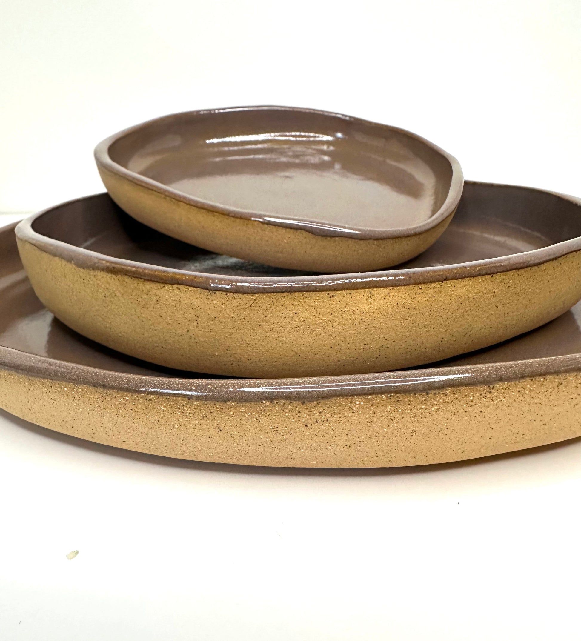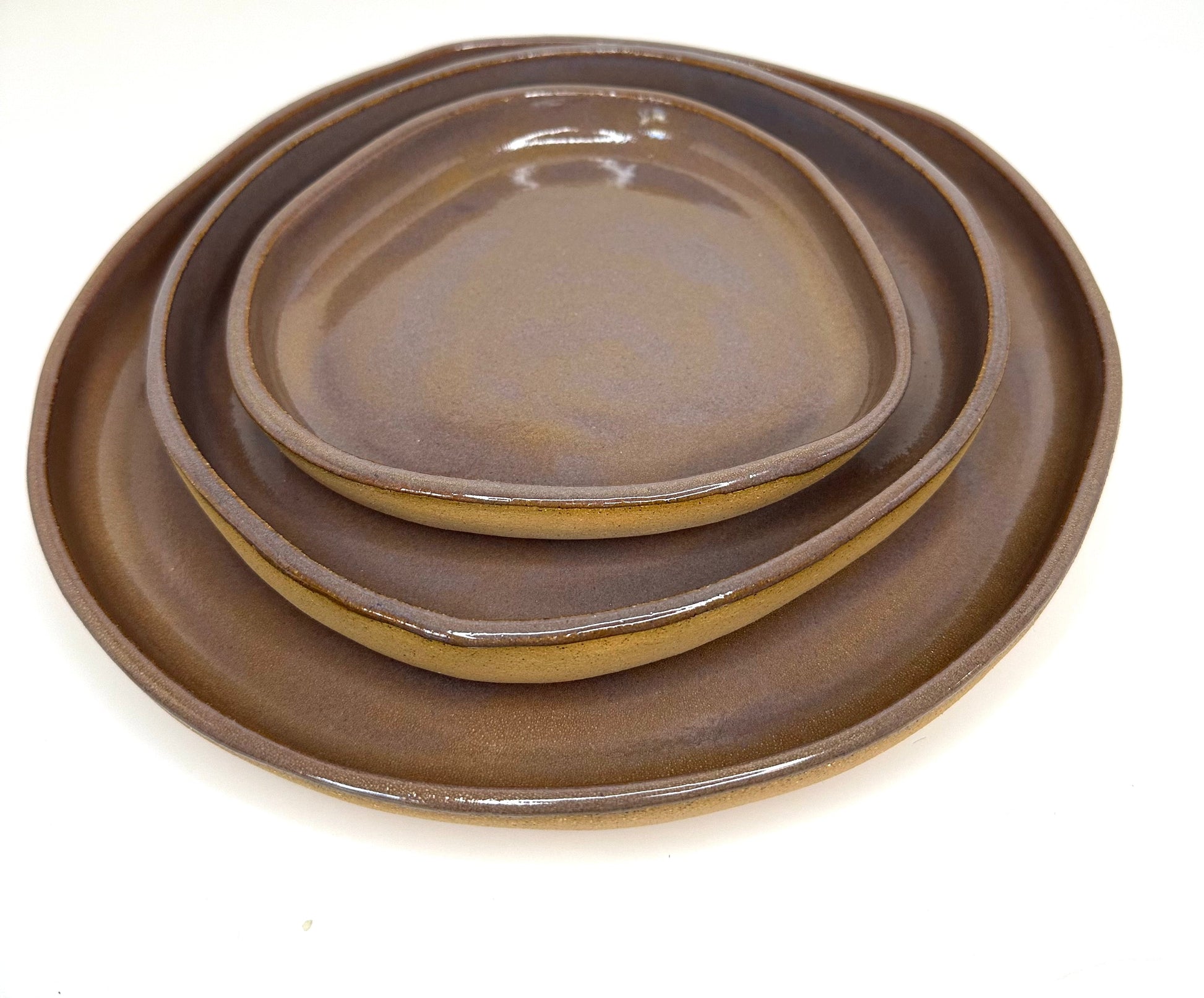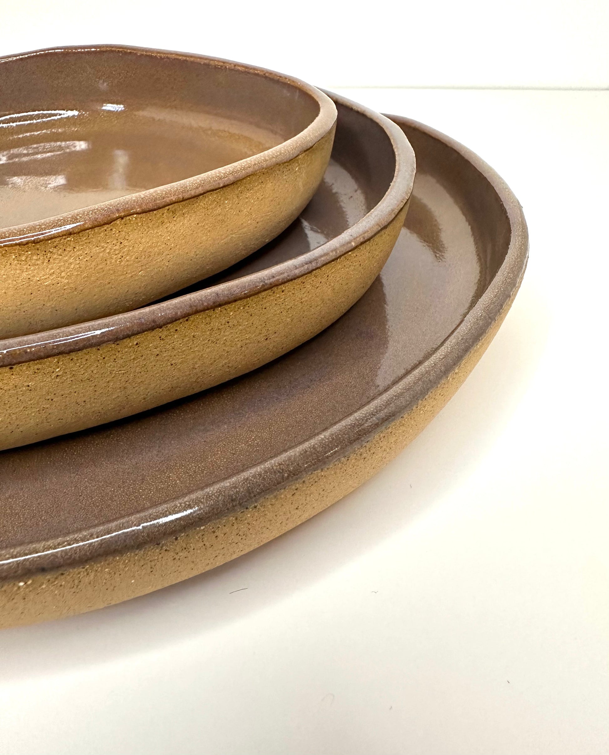 Set of three handcrafted plates, one of each size. Large (11" diameter), medium (8.5" diameter), and small (6 "diameter), all 1" tall. Due to the artisanal nature of these pieces, slight variations in height and size are to be expected, a charm of handmade craftsmanship. These versatile plates/bowls are perfect for various uses. Mix and match with the medium and small FRECKLES collection of plates and cups to create your unique combinations. CLAY: Light brown with black speckles. GLAZE: Glossy Mushroom color. Handcrafted from USA-sourced clay. Unique, mold-free, small-batch production. Glazed finish (not microwave-safe). We recommend handwashing to prevent surface decay and scratches. Please note that slight variations in size may occur due to the clay's natural behavior during the drying and firing process.