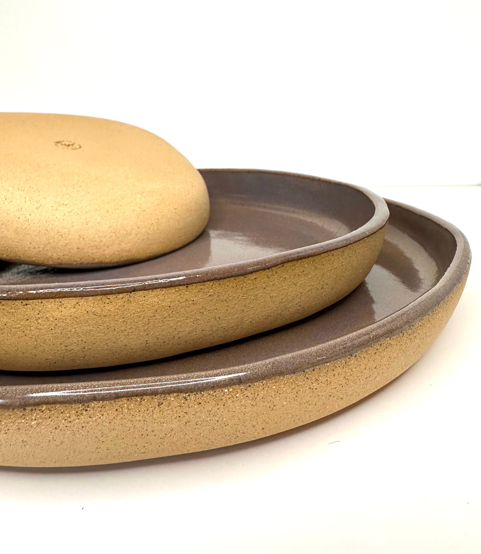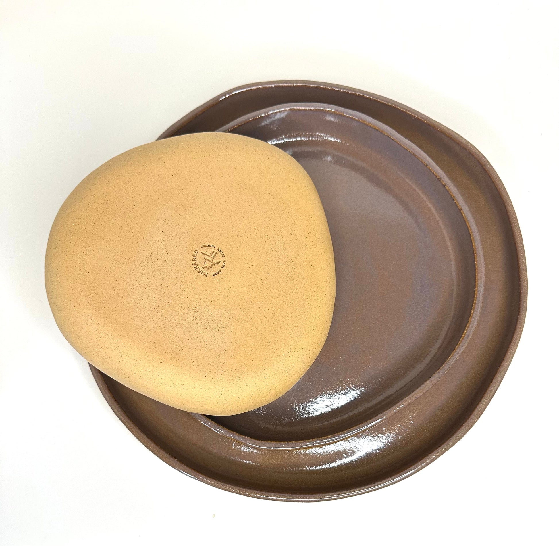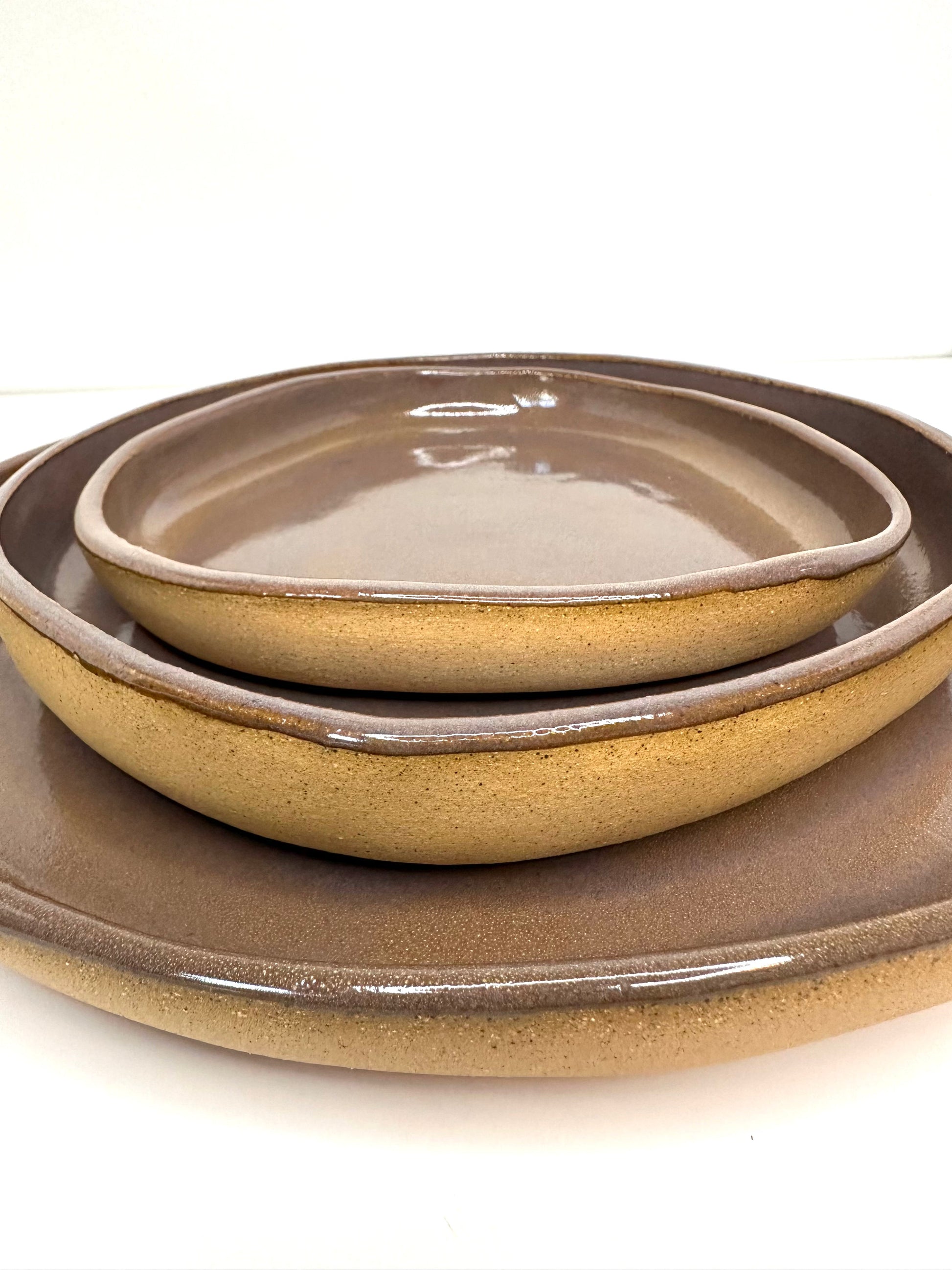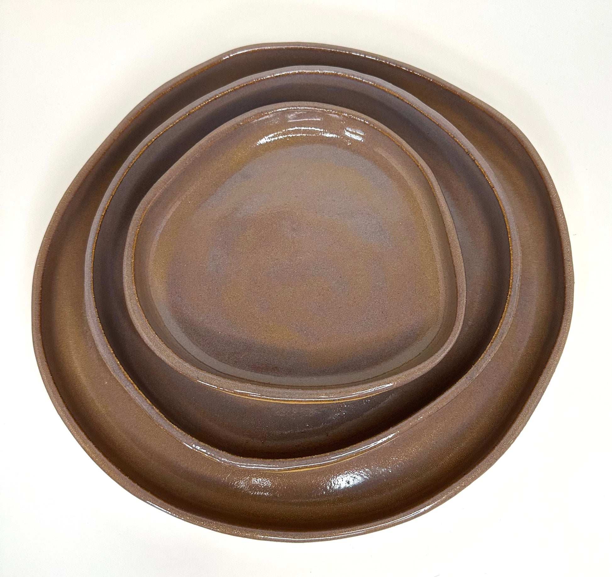 Set of three handcrafted plates, one of each size. Large (11" diameter), medium (8.5" diameter), and small (6 "diameter), all 1" tall. Due to the artisanal nature of these pieces, slight variations in height and size are to be expected, a charm of handmade craftsmanship. These versatile plates/bowls are perfect for various uses. Mix and match with the medium and small FRECKLES collection of plates and cups to create your unique combinations. CLAY: Light brown with black speckles. GLAZE: Glossy Mushroom color. Handcrafted from USA-sourced clay. Unique, mold-free, small-batch production. Glazed finish (not microwave-safe). We recommend handwashing to prevent surface decay and scratches. Please note that slight variations in size may occur due to the clay's natural behavior during the drying and firing process.