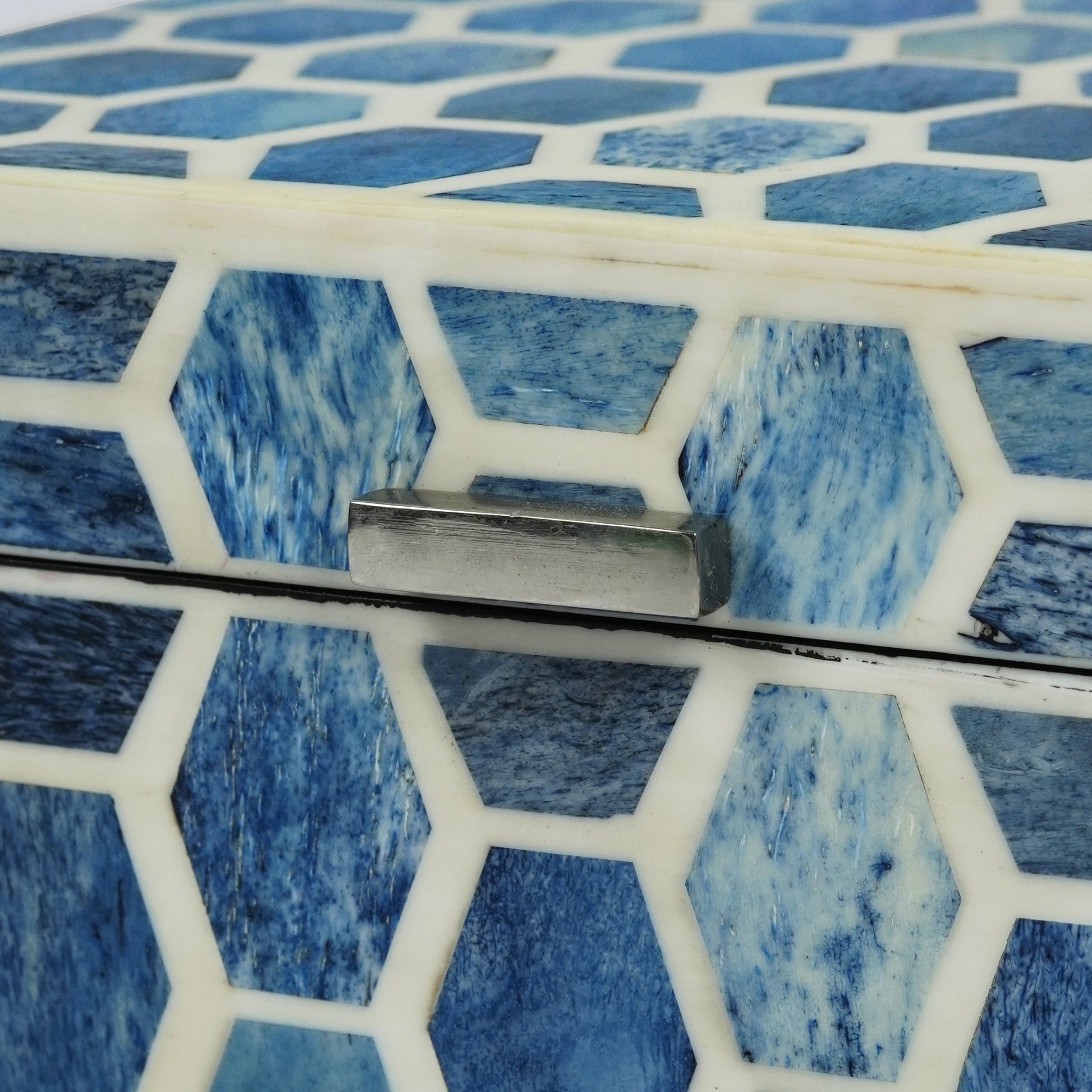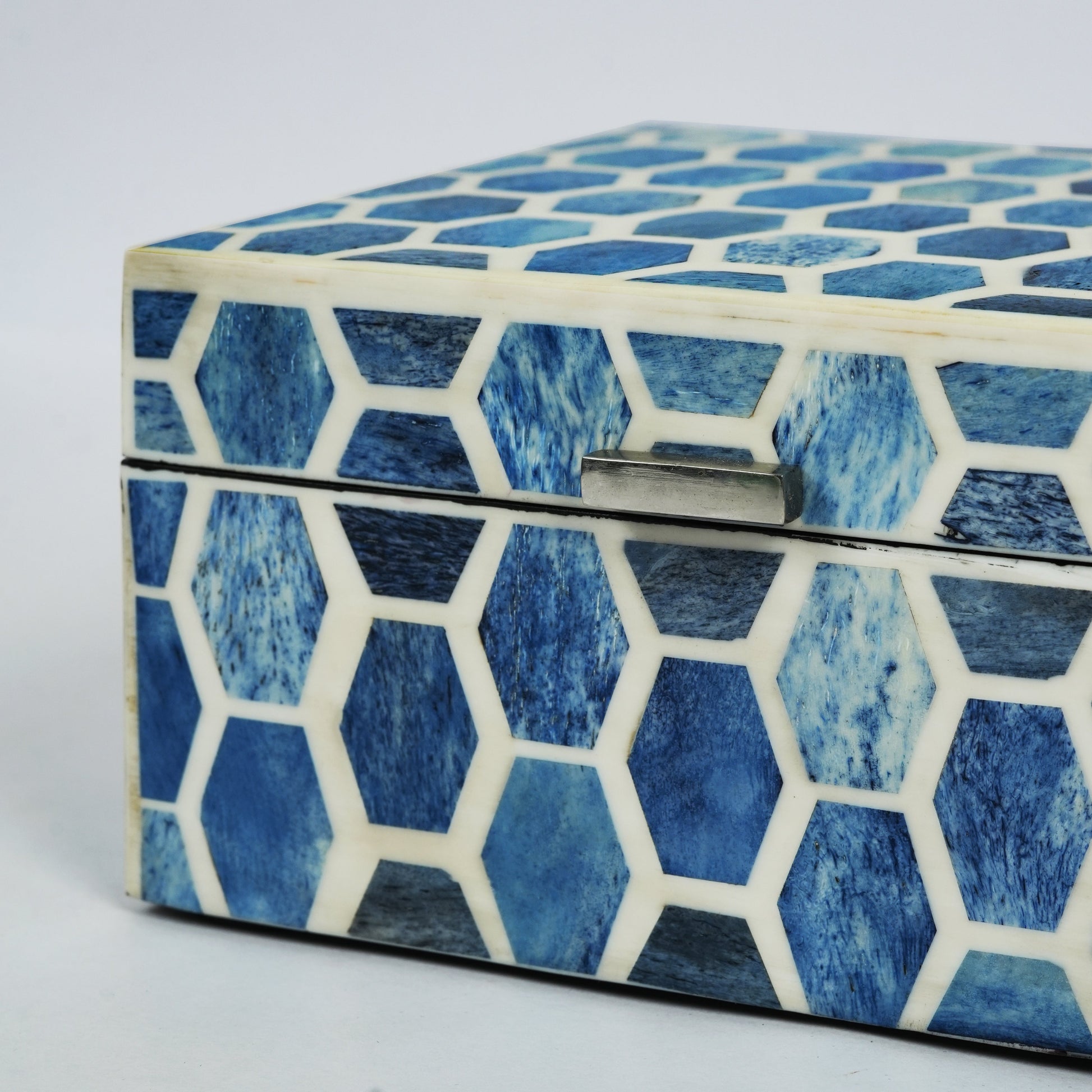 Bring timeless elegance to your space with the Gramercy Square Storage Box, featuring a hand-inlaid indigo and white bone pattern that blends traditional craftsmanship with modern charm. Perfectly sized at 6” x 6” x 4”, it’s ideal for organizing jewelry, keepsakes, keys, or small essentials while adding a refined touch to your vanity, entryway, or shelf. Crafted & finished with intricate bone and resin work, this box is both functional and decorative. A beautiful artisan-made gift for housewarmings, weddings, or special occasions.