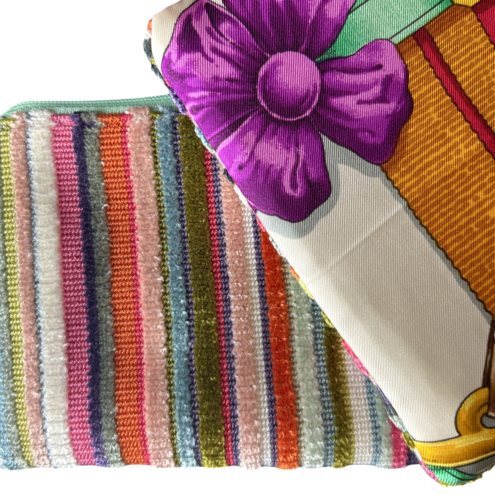 Vintage Hermes Grand Manege scarf front paired with striped velvet reverse. Fully lined, zippered closure with removable gold-tone keyring and lobster clasp