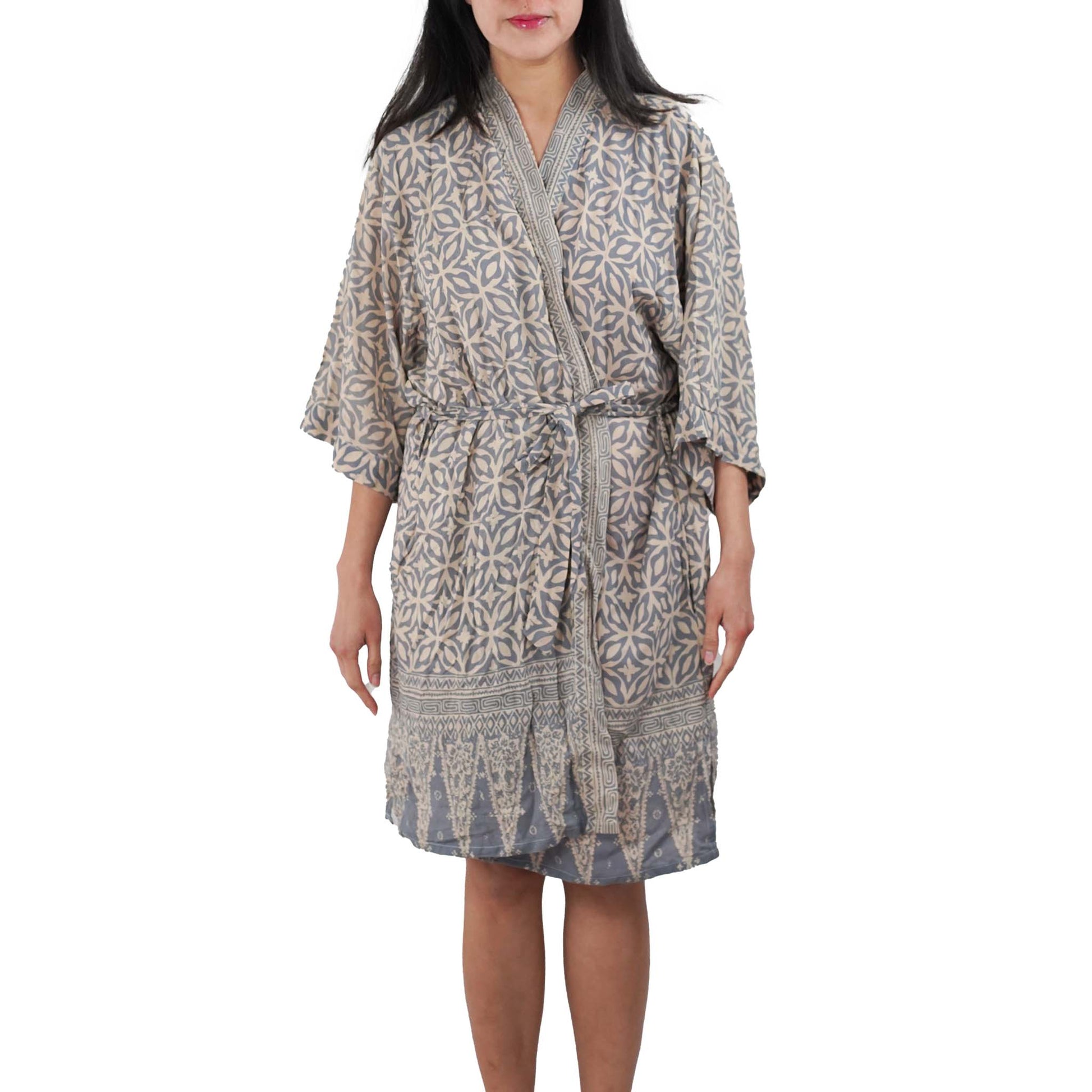 Handmade Batik Robe Kimono, 100% Cotton Soft, Gray White Harmony