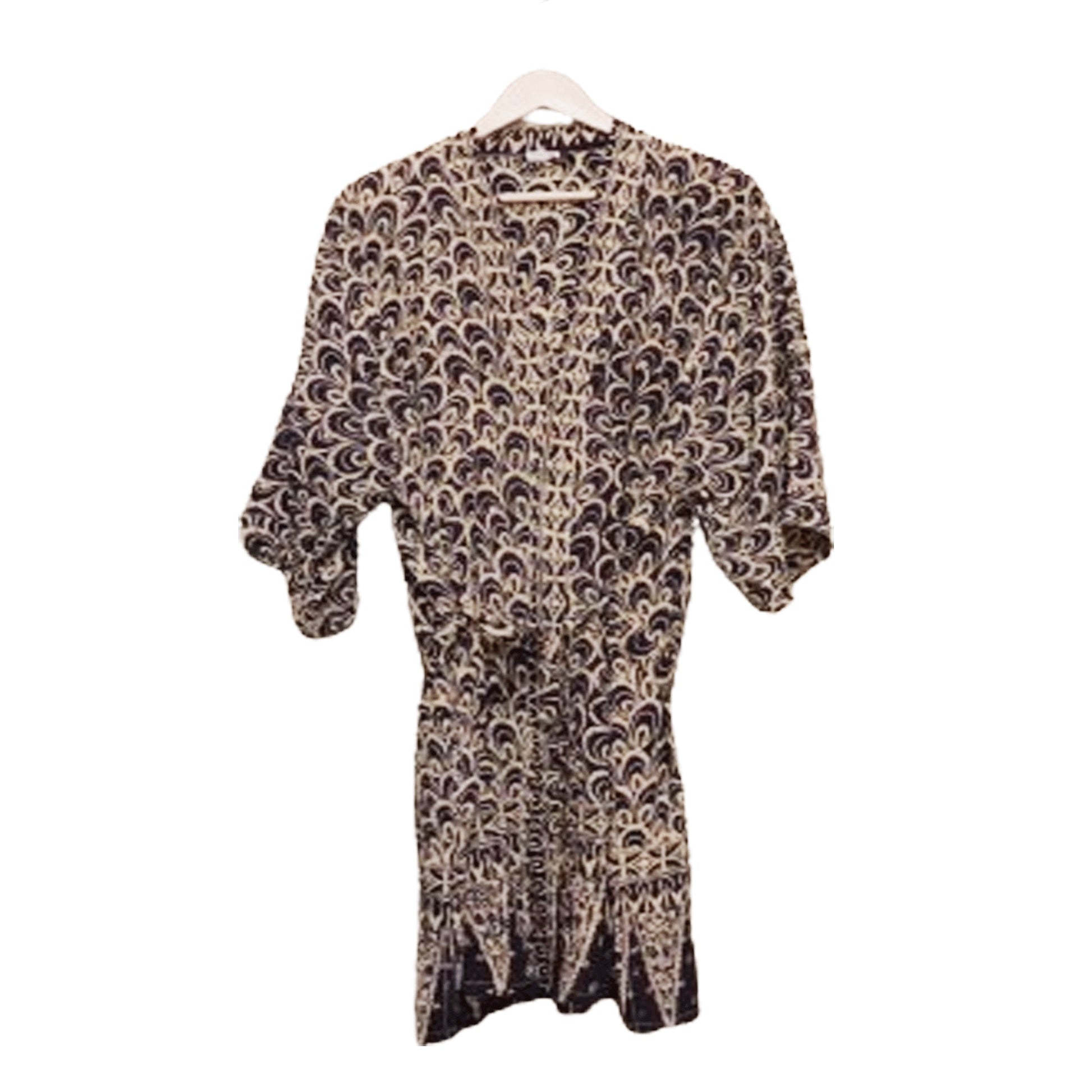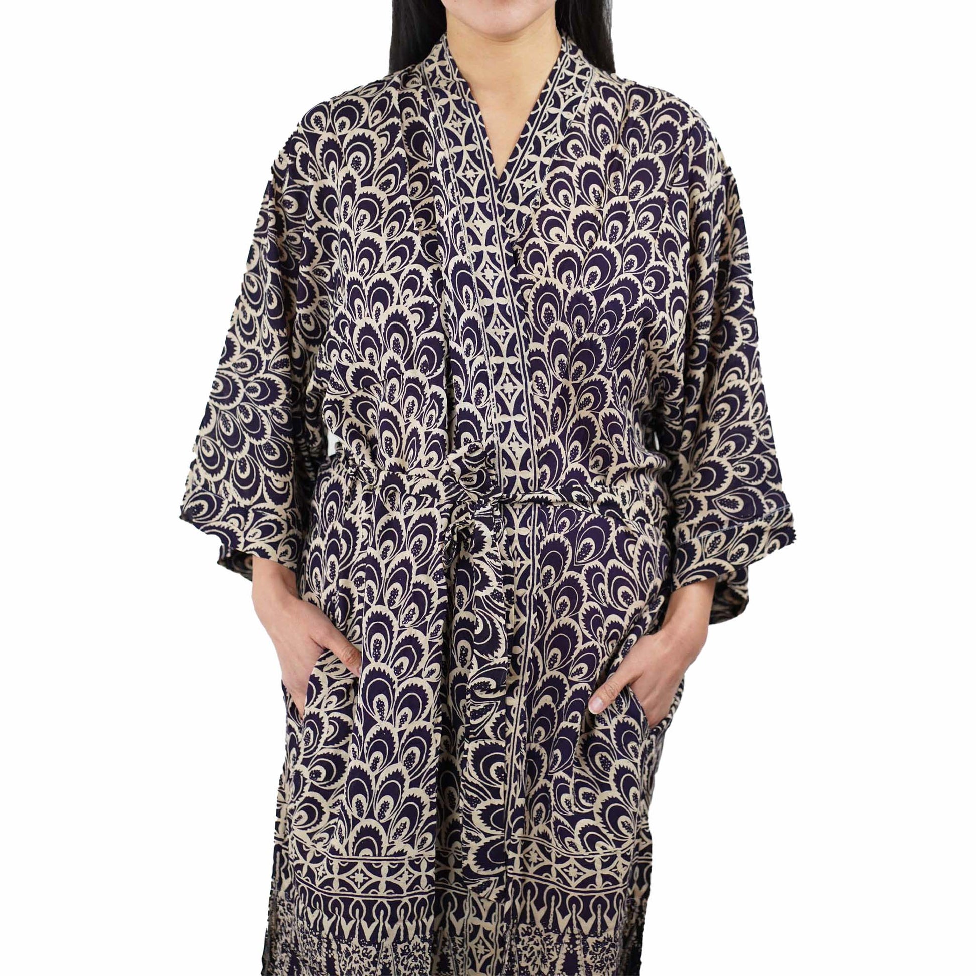 This batik kimono robe is made from white cotton fabric that is then hand-stamped and hand-dyed using 700 years old batik wax and dye technique. The batik fabric is also then sun baked.