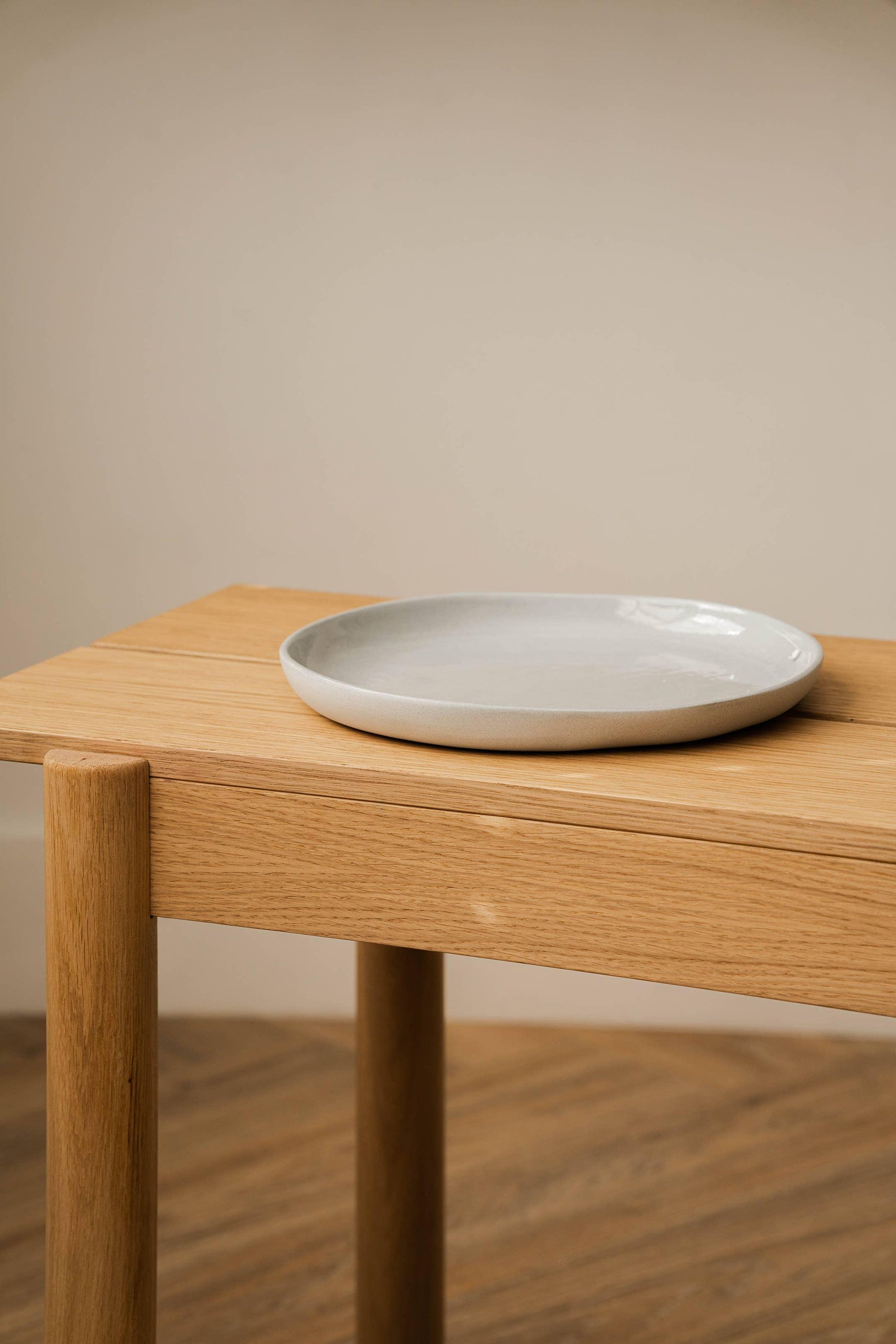 Our new handmade porcelain dinner plate sets the table with clean elegance. Dinnerware is glazed shiny neutral inside and smoothly polished on the outside. -