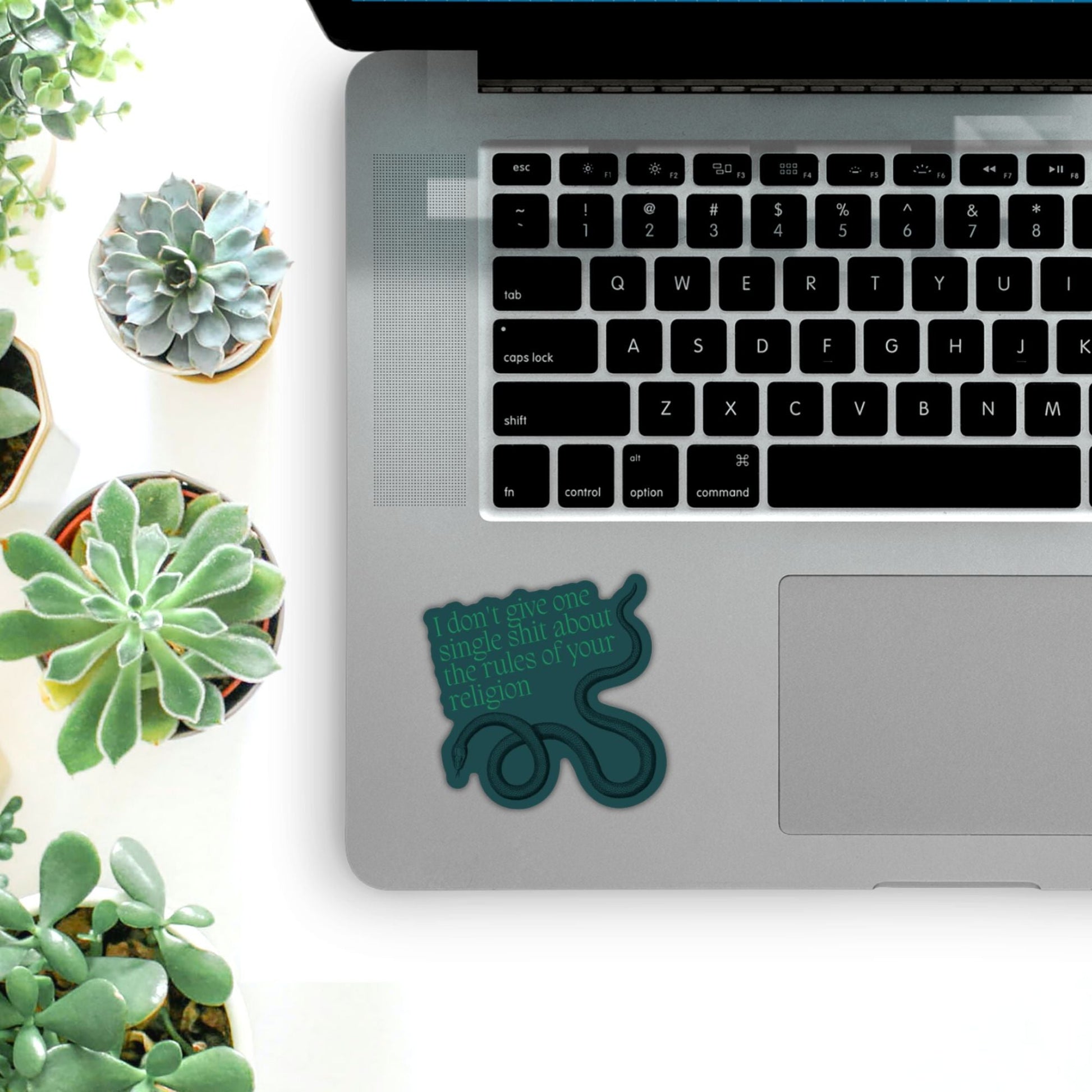 Glossy die cut sticker reads I DON'T GIVE ONE SINGLE SHIT ABOUT THE RULES OF YOUR RELIGION.