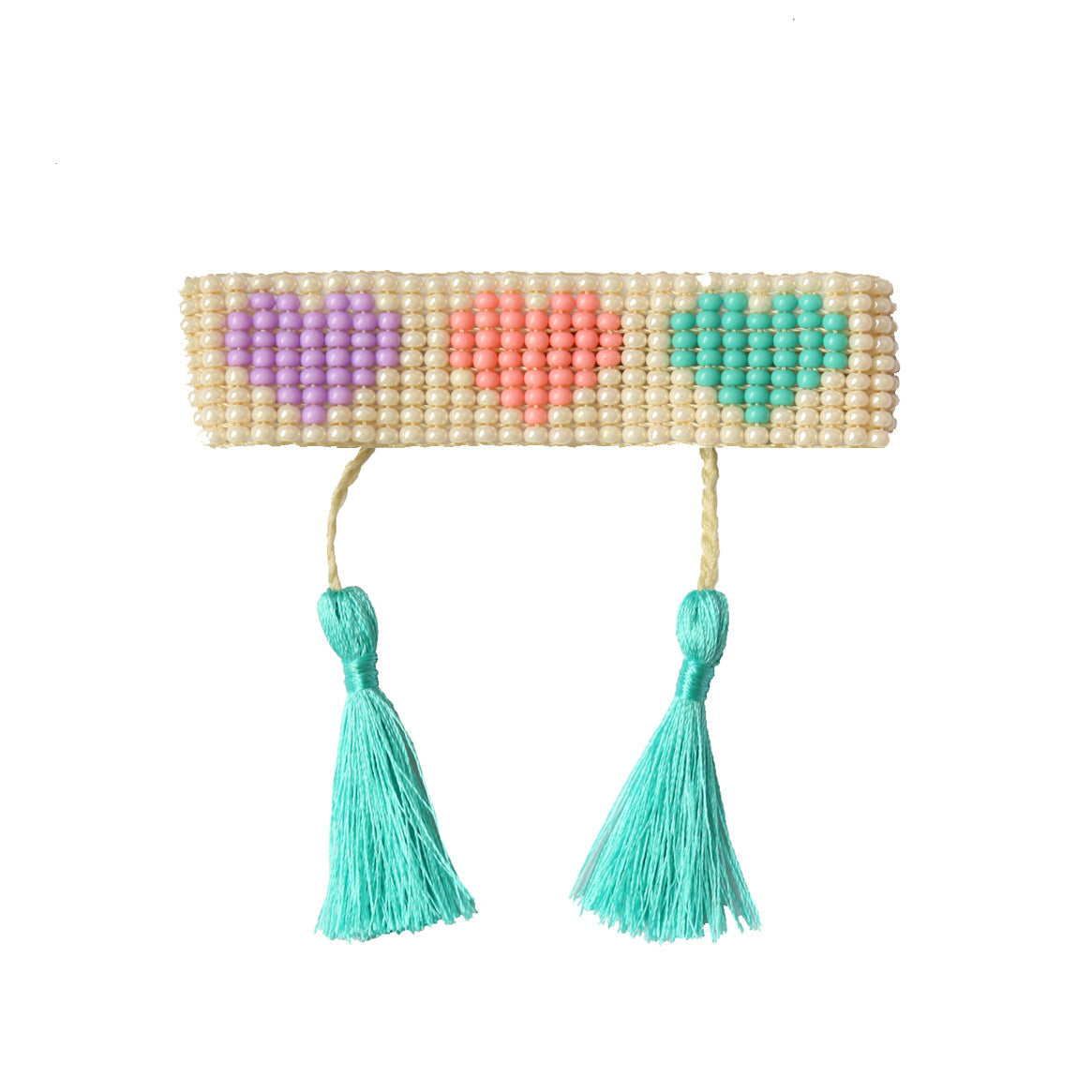 Pearl beaded bracelet with 3 heart design and teal tassels