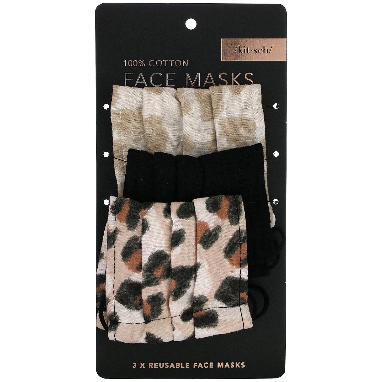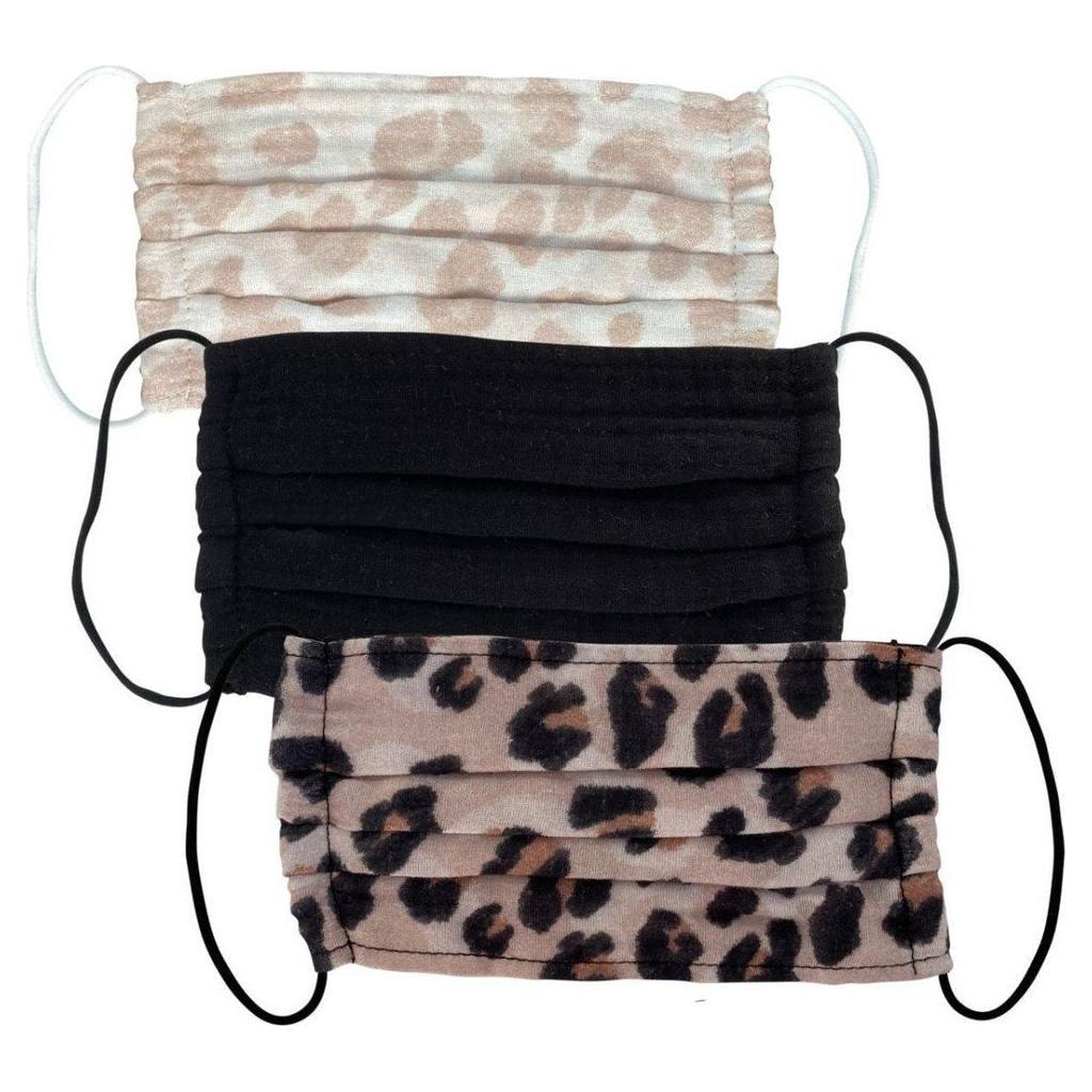 100% cotton face mask 3pc set in 3 assorted patterns: neutral tie dye, solid beige, and micro dot.