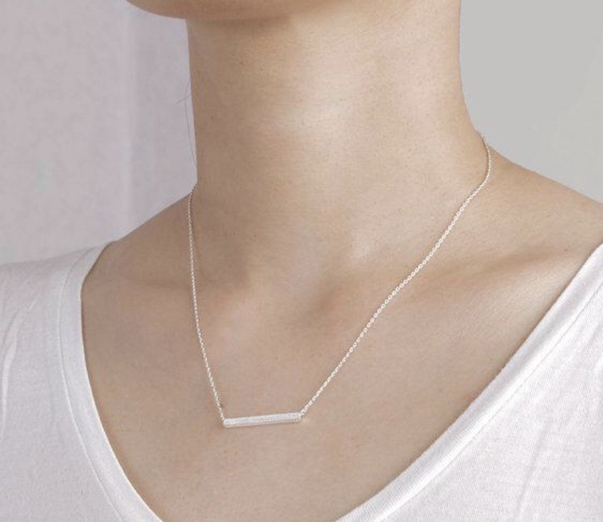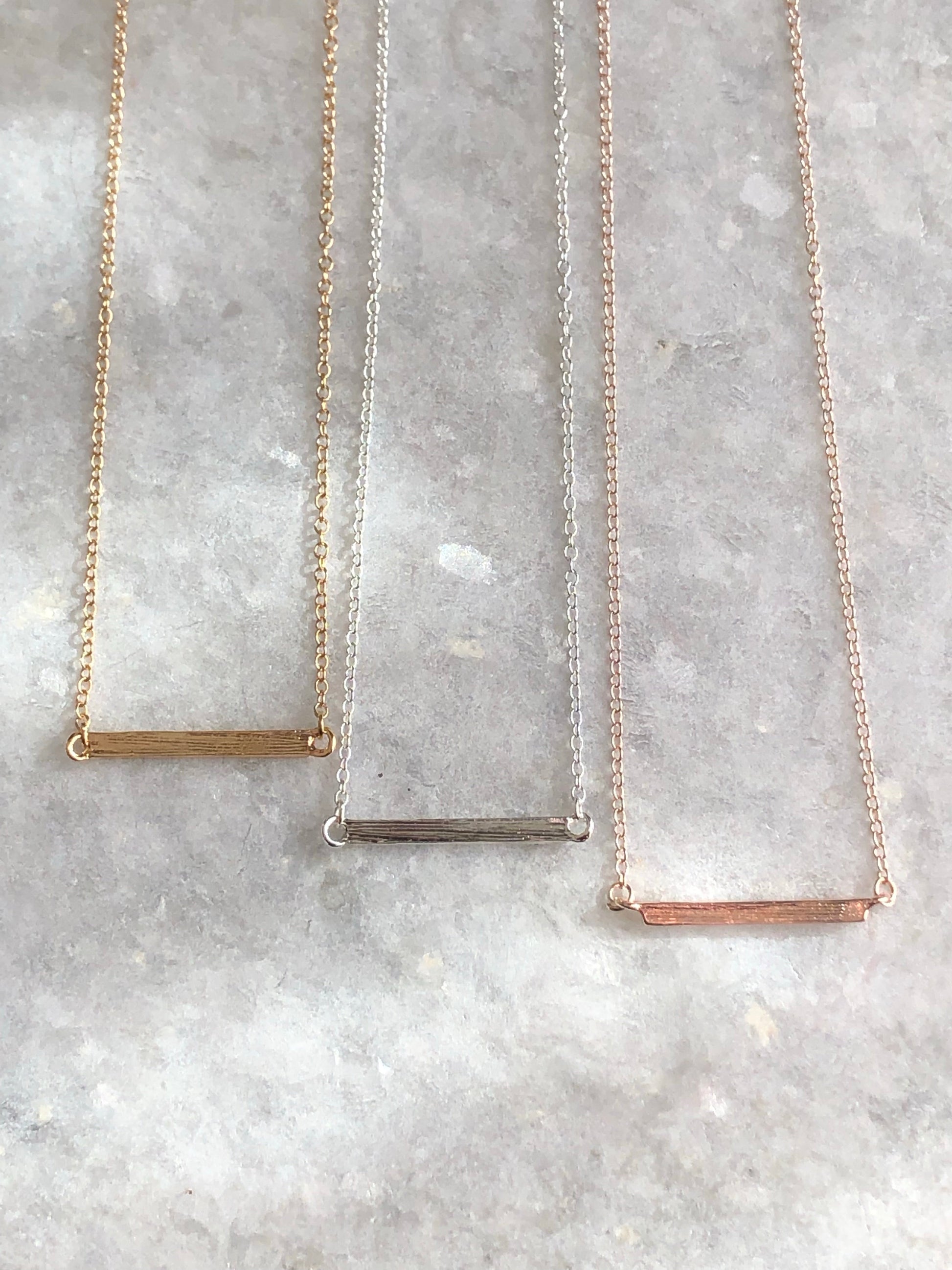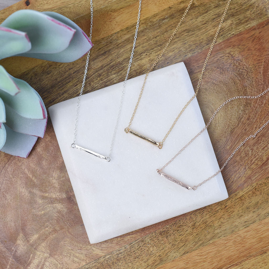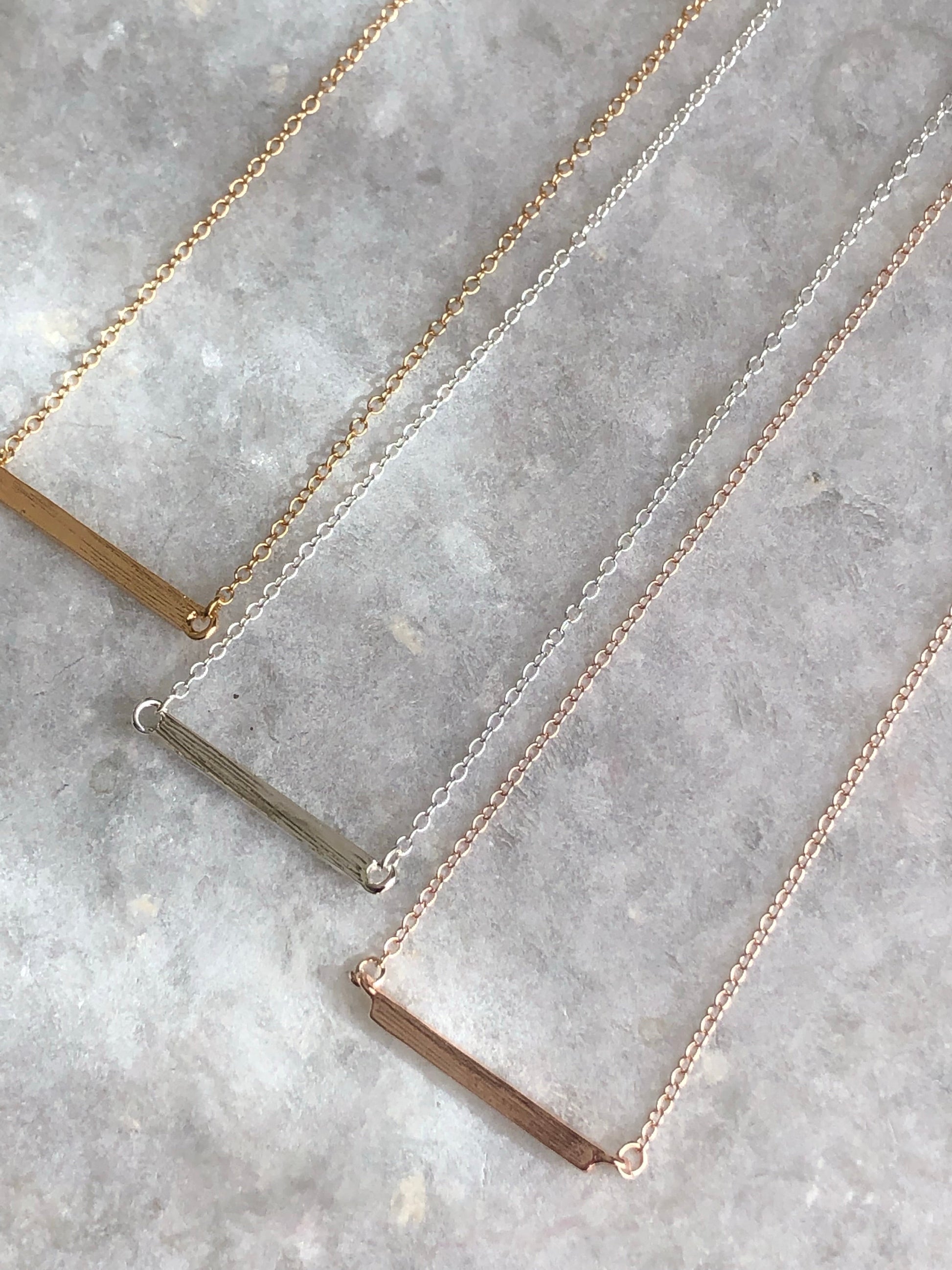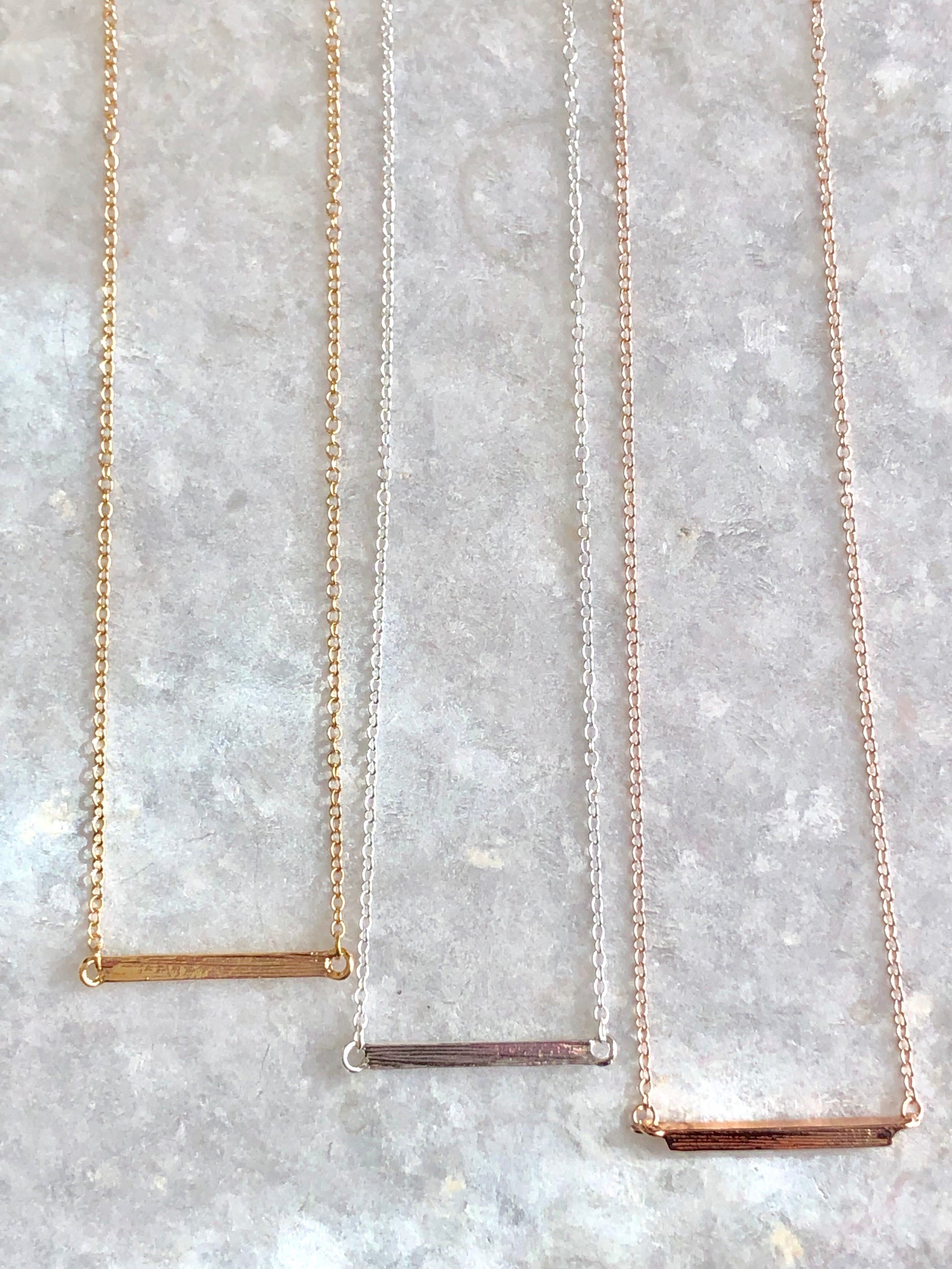 Fashionable latitude bar necklace that goes with any outfit. Comes on a 19" chain with a 2.5" extender. Available in silver, gold, and rose gold.