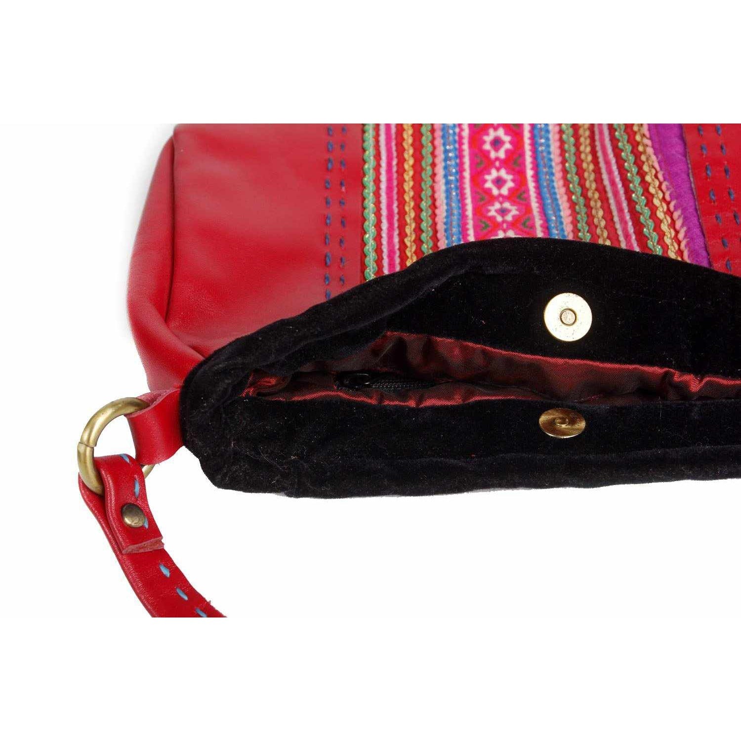 Soft leather is combined with gorgeous embroidered Hmong fabric to create this gorgeous cross-body bag. Lined inside with an inside pocket.