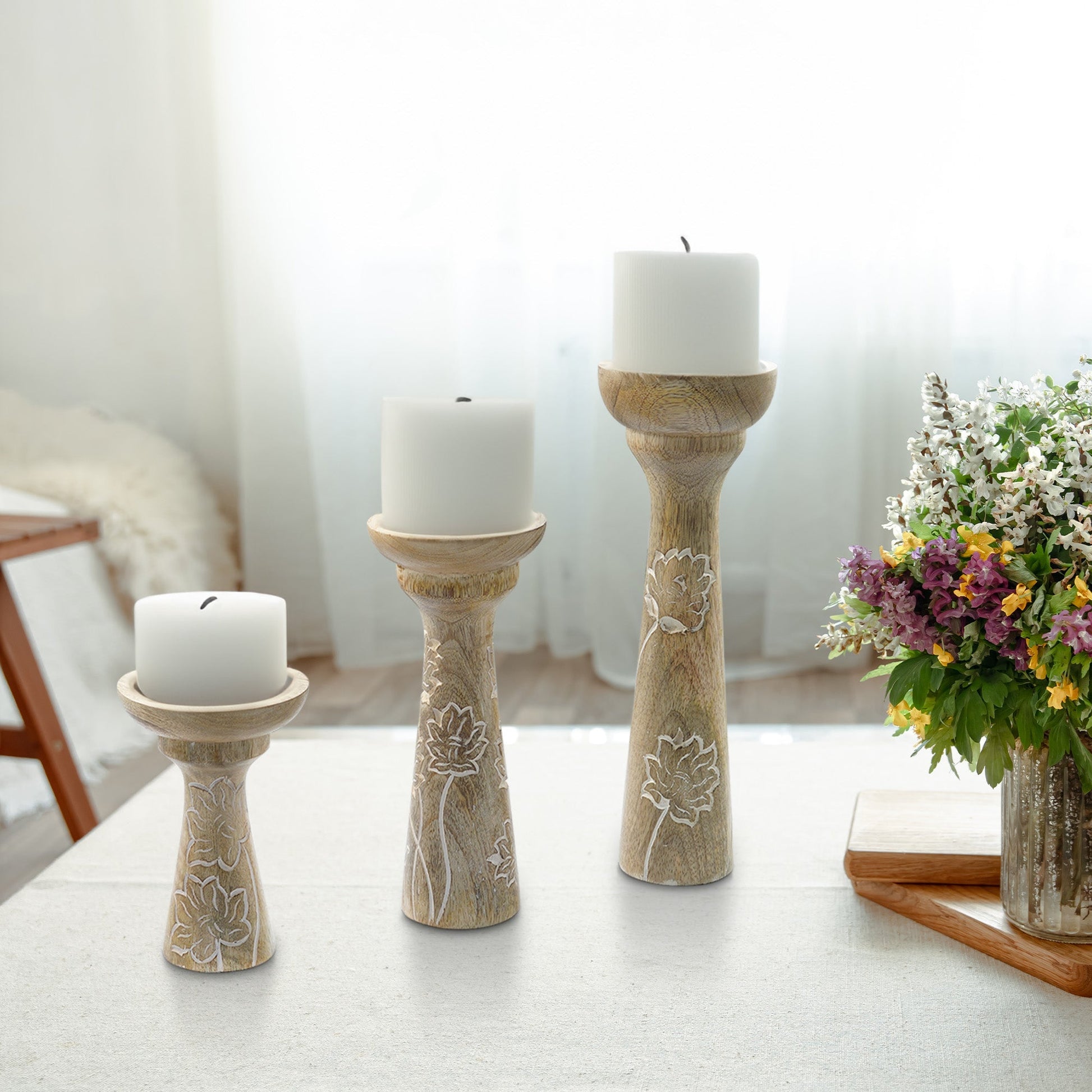 Lotus Vine Pillar Candleholder Set - Whitewash