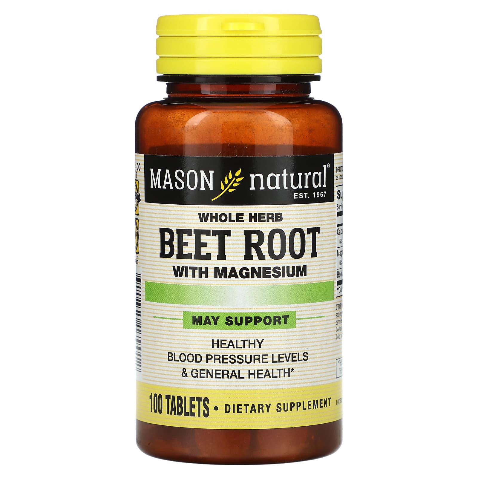 Mason Natural whole herb Beet Root juice powder tablets contains 150mg of beet root juice powder per serving plus 150mg of magnesium which may support healthy blood pressure levels, as well as, boosting sports performance. Our once a day Beet Root Juice with magnesium is guaranteed no added artificial colors or flavors, no preservatives, no fragrance, no starch, no yeast, no soy, no corn, no wheat, no dairy, no fish, no tree nuts, no peanuts, no eggs and is Sodium Free and Soy Free. Several studies have shown that beet root may support normal, healthy blood pressure by virtue of its high levels of bioavailable nitrite, which can be converted easily to nitric oxide. Nitric oxide and magnesium together, may support a healthy response to stress and support the body’s exercise endurance.