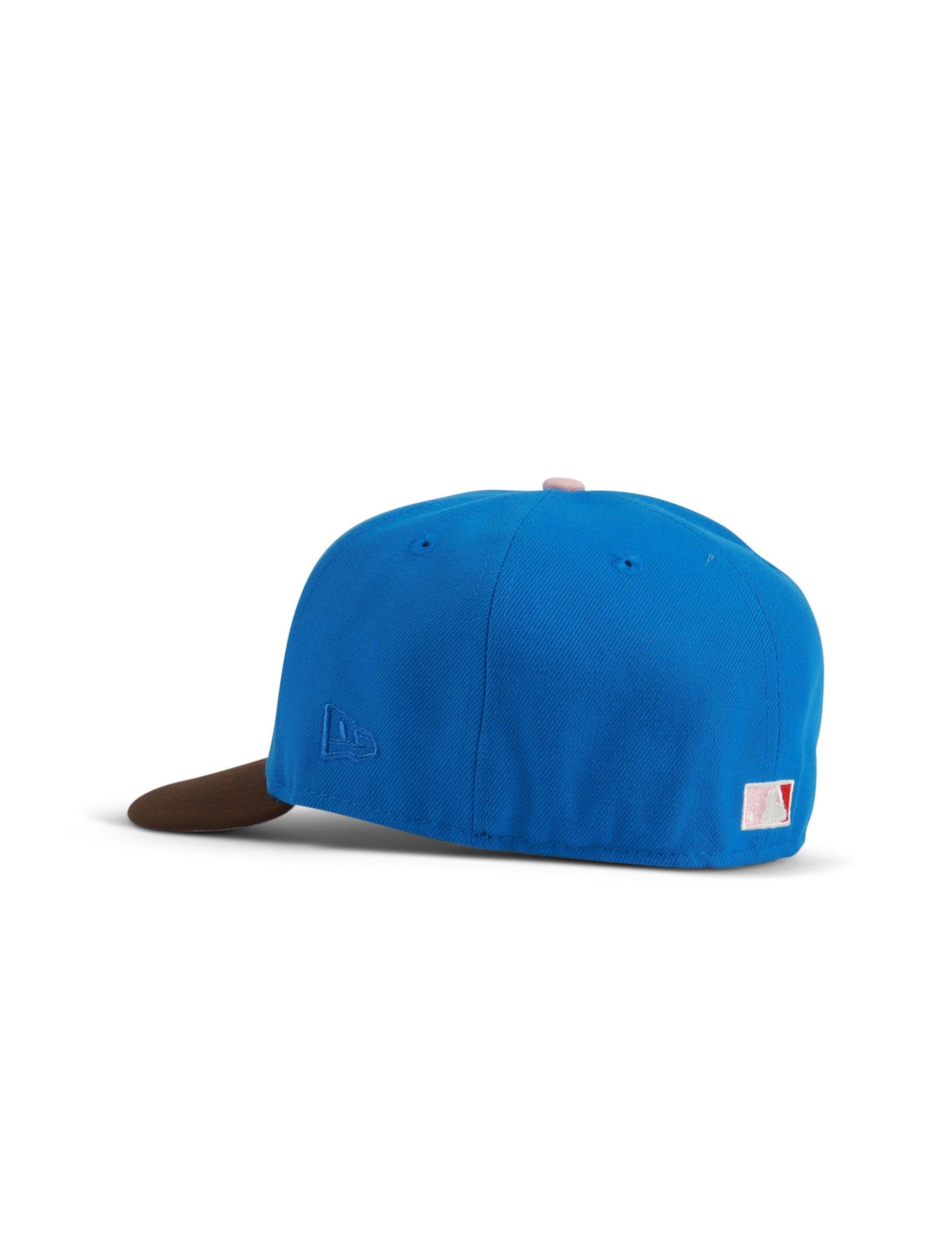 The Dodger Authentic Collection Alt 59FIFTY Fitted cap features an all-over blue fabrication with Dodgers embroidered lettering in pink on the front panels and a custom world series patch on the side. The under brim features a pink which matches the side Jackie Robinson patch.