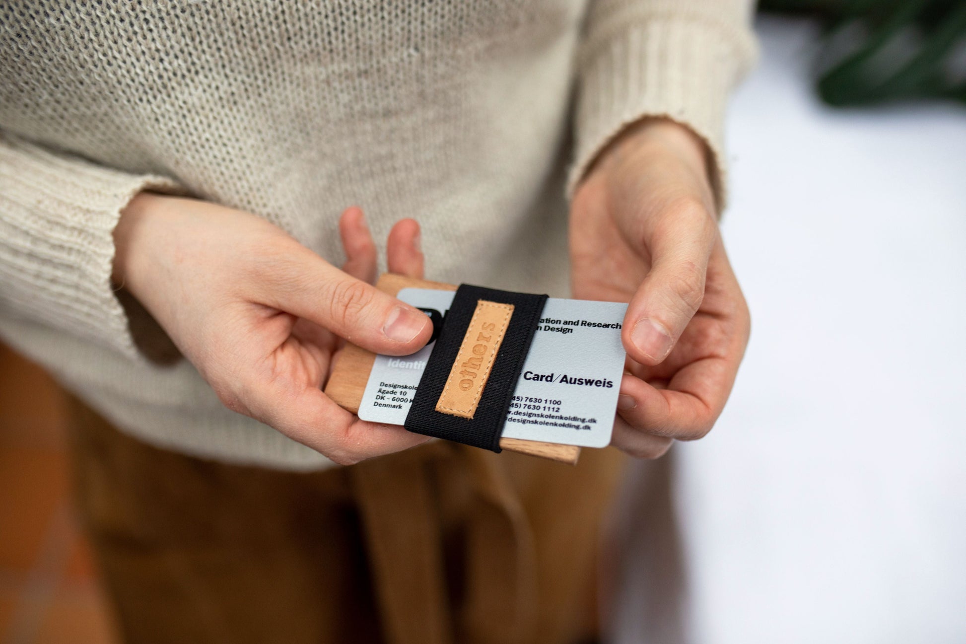 Sleek wooden card holder with an elastic band to keep you credit cards in place. The card holder is handcrafted from local wood by skilled carpenters at our workshop in Jashore, Bangladesh. It is a good way of utilizing waste material from other production.