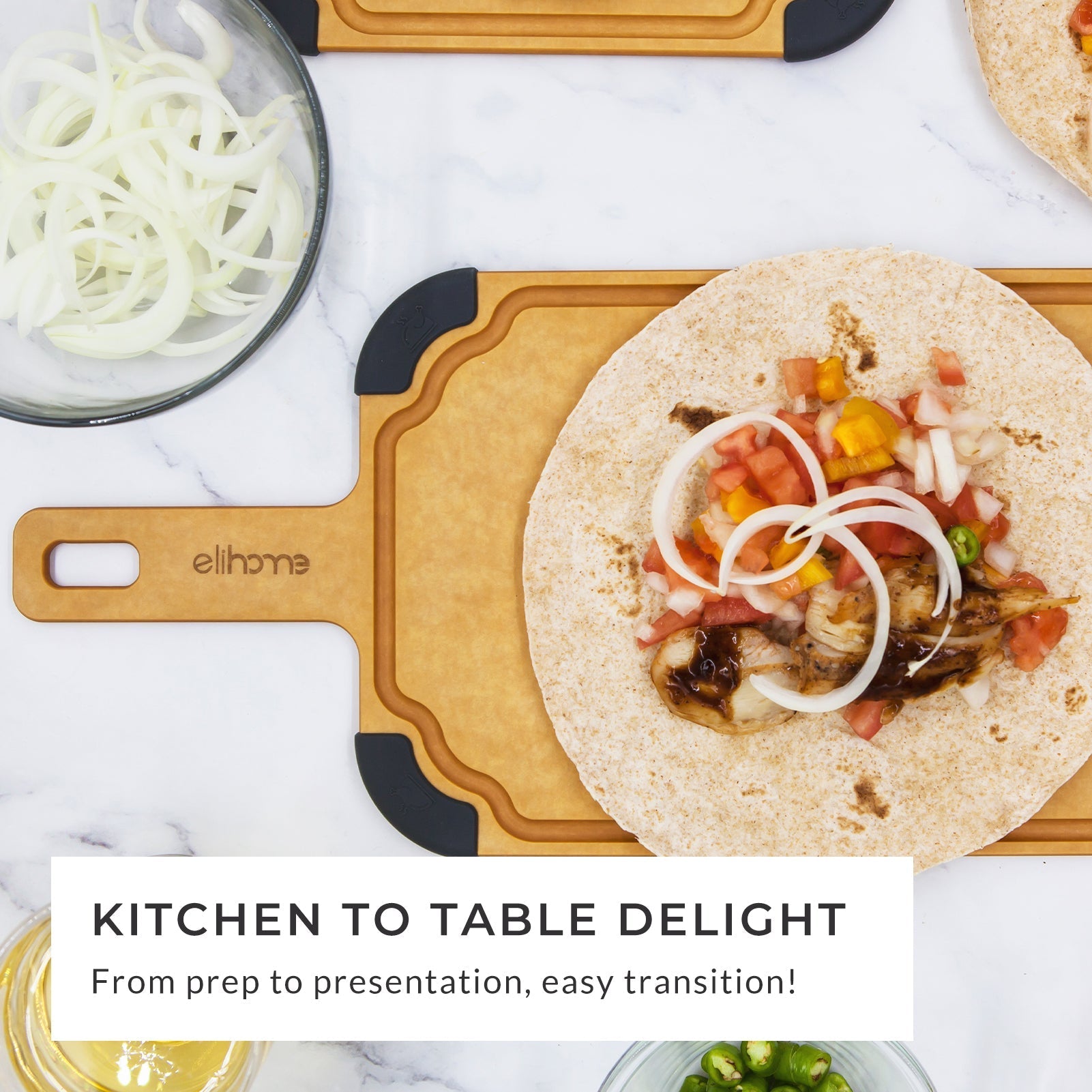 Crafted from high-density pine leaf fiberwood, this cutting board is a sustainable, eco-friendlychoice for your kitchen. Its reversible, double-sided design allows you to switch between surfaces for different food types, enhancing food safety while reducing your carbon footprint.
