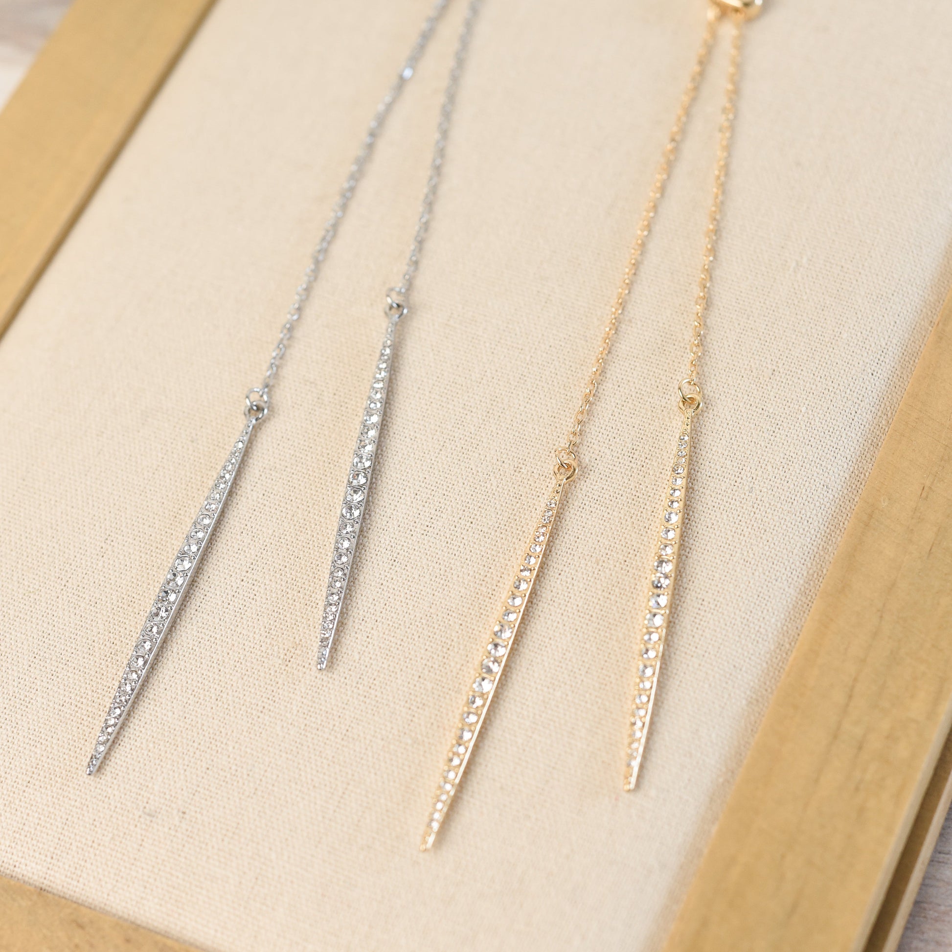 Available in three gorgeous colors. This longer necklace has a lariat style cinch and intricate pave details.