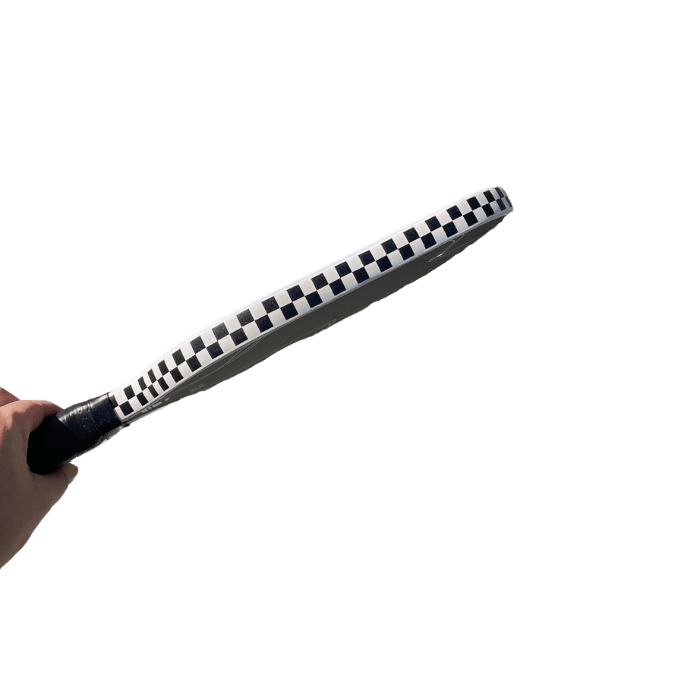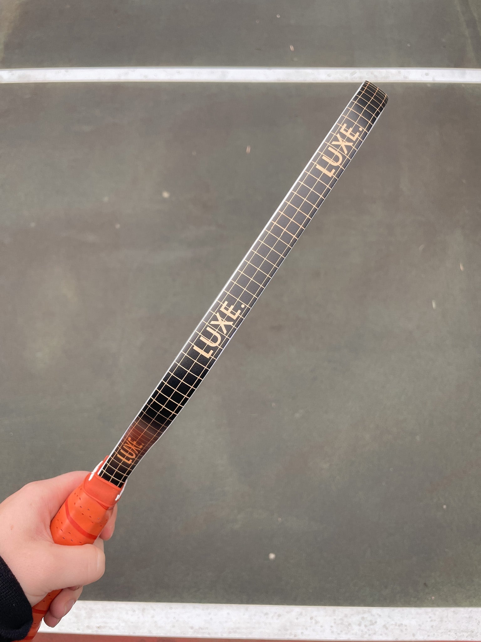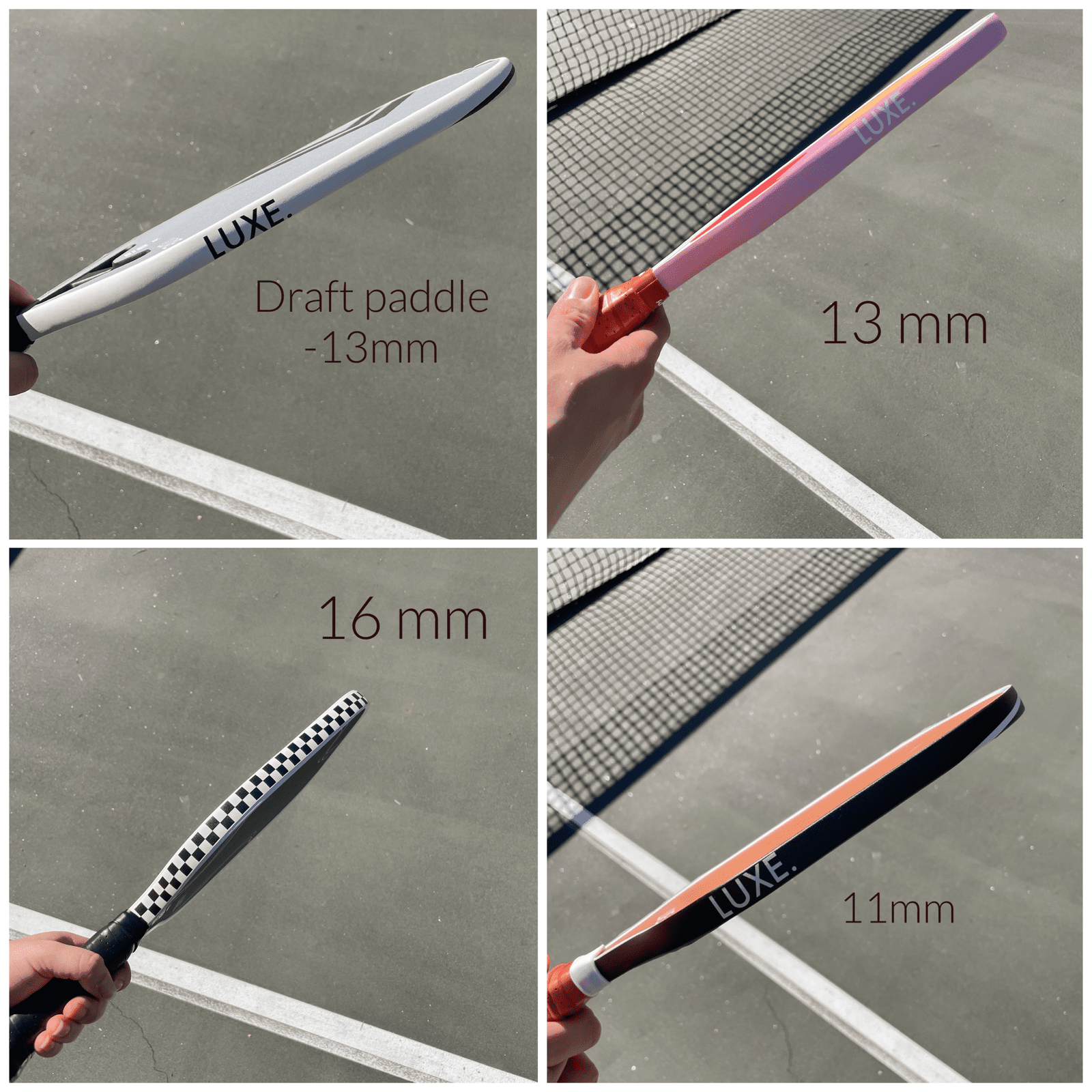 1.7 cm (17 mm) wide. See photos of how it fits on different-sized paddles, will work on 11mm-16mm thick paddles.