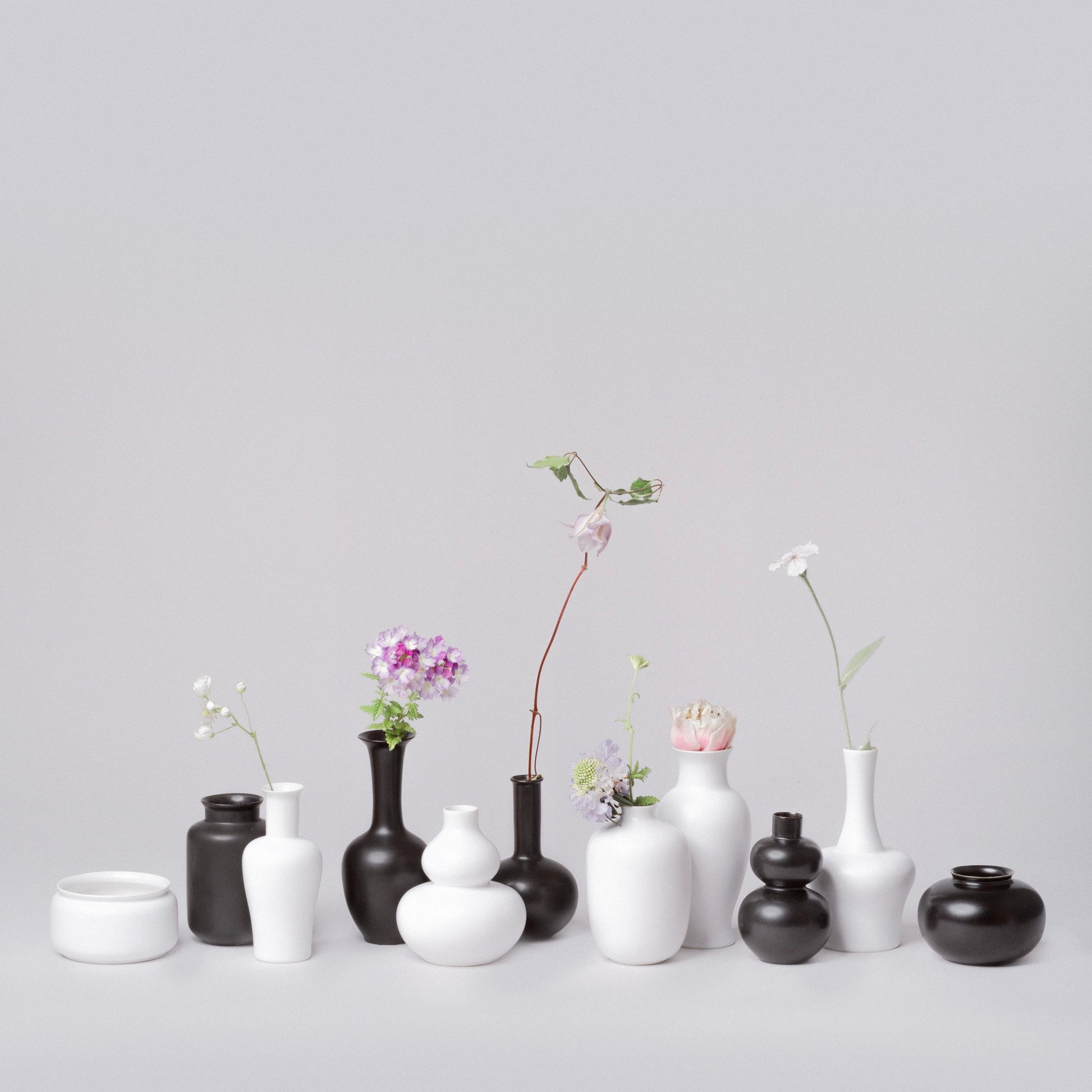 semi-matte glazed porcelain in black or whiteH x D: 4. 5 in x 2. 75 inOur neutral mini vases dress up, dress down, hold flowers, create sculptural statements, set beautiful tables, make great gifts, and fit in everywhere.