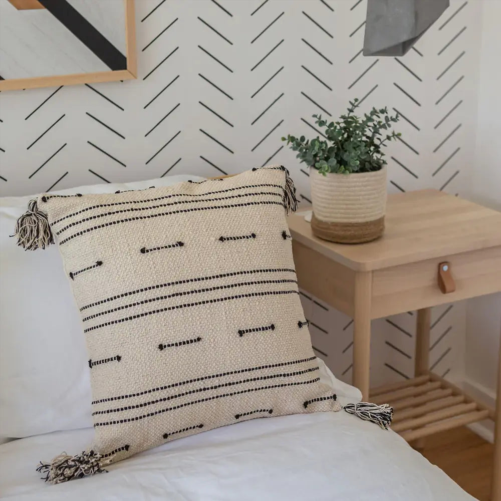Maker: Bit of Meraki Intricate thread work making up a gorgeous weave and plush tassels on each side are a must add to your home. Available in shades of black and white, it can be paired with just about anything. Handmade by artisans, there might be natural variations making each one truly unique. Weight: 0. 5 lbs 18" x 18"
