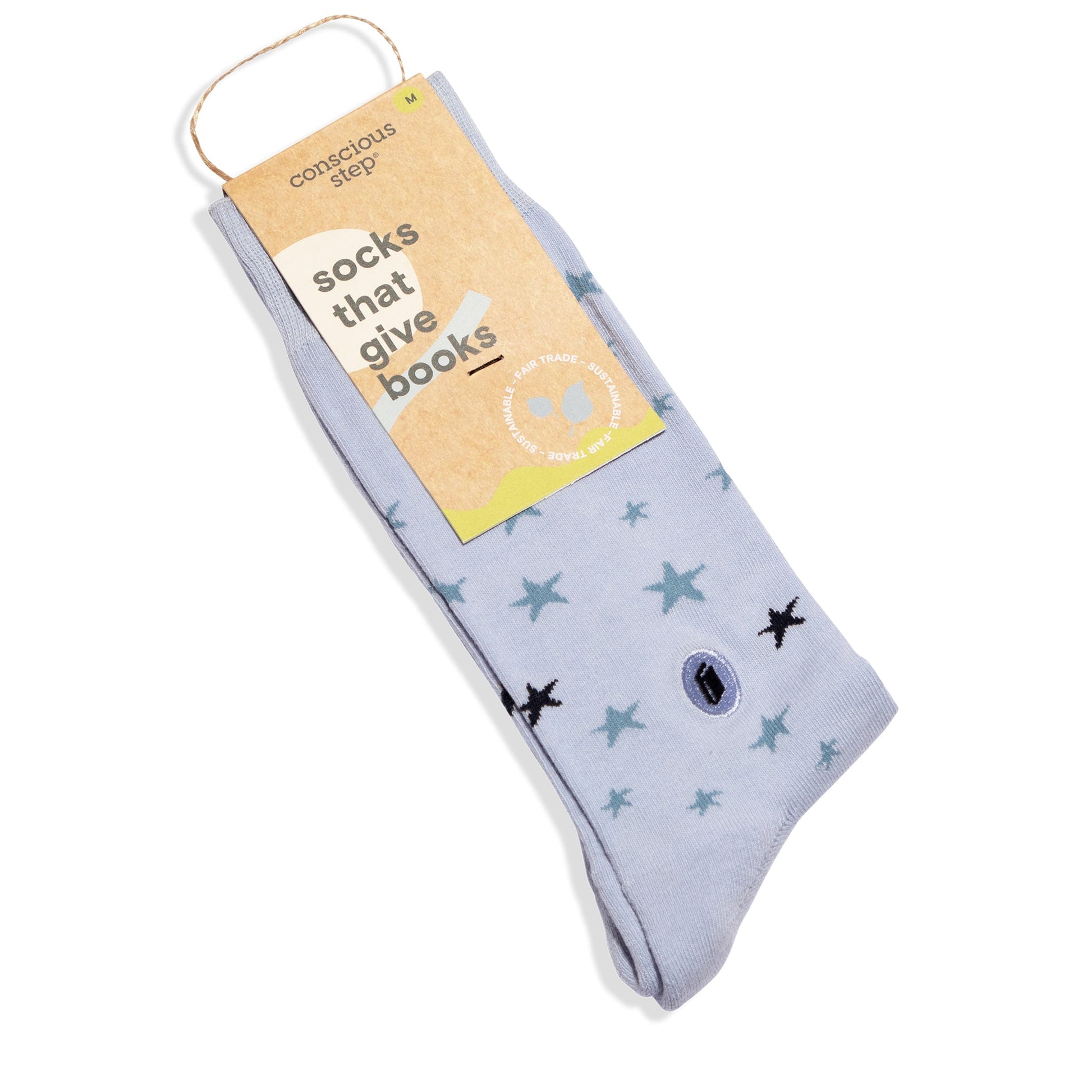 Reach for the stars! Give books to kids and help them dream big in these starry socks featuring a multi-colored blue design and a book embroidery.