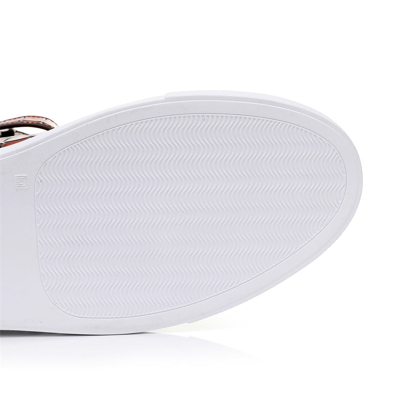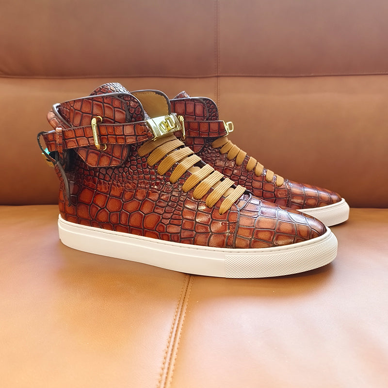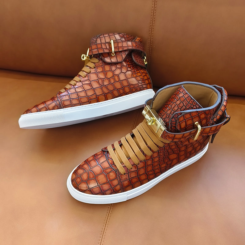 The Luxalon Lace-Up Elegance Sneakers feature a genuine cow leather upper with a stylish croc-print pattern, a medium heel height ranging from 1.2 to 2 inches, and a lace-up closure, offering a true-to-size fit for comfortable wear.