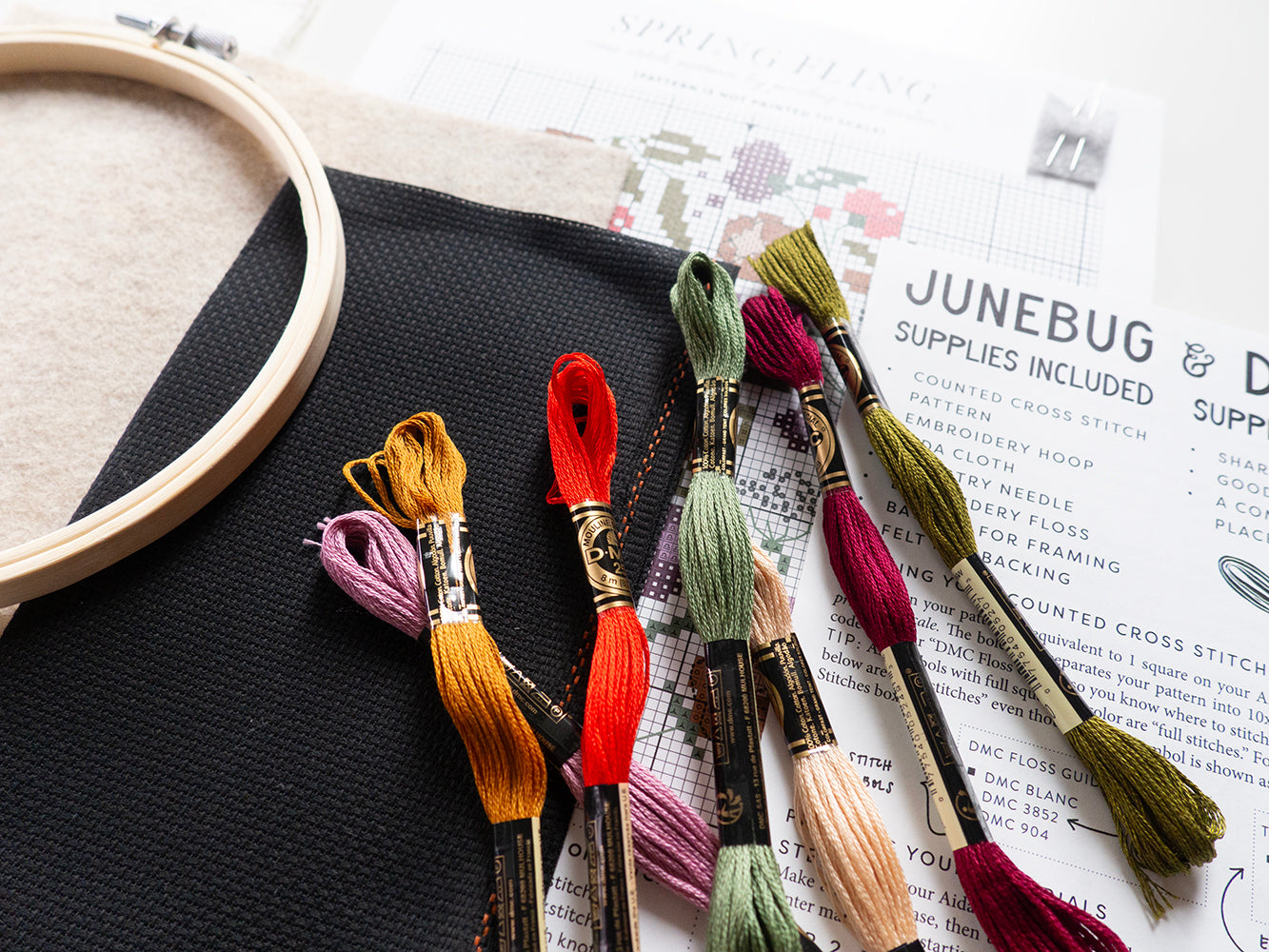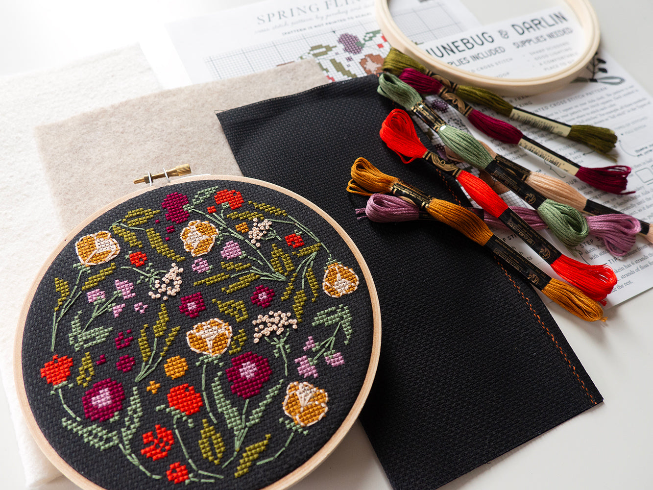 Elevate your cross stitching game with our Spring Fling Kit. This intermediate level kit includes all supplies needed to create beautiful floral designs on black cloth. Perfect for celebrating the arrival of spring and adding a touch of fun and color to your home décor.
